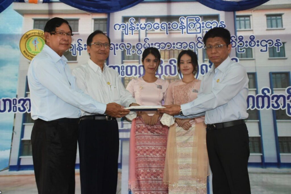 | ထို့နောက် ဆေးတက္ကသိုလ်(၁)၊ ရန်ကုန်၏ “သမားဂုဏ်ရည်ဆောင်” ဖွင့်ပွဲအခမ်းအနားကို မင်းကျောင်းလမ်း၊ဒဂုံမြို့နယ်တွင် ဆက်လက်ကျင်းပရာ ကျန်းမာရေးဝန်ကြီးဌာန၊ ပြည်ထောင်စုဝန်ကြီး၊ ရန်ကုန်တိုင်းဒေသကြီးအစိုးရအဖွဲ့ ဝန်ကြီးချုပ်၊ ရန်ကုန်တိုင်းဒေသကြီး လူမှုရေးဝန်ကြီး၊ ကျန်းမာရေး လူ့စွမ်းအားအရင်းအမြစ်ဦးစီးဌာန၊ ညွှန်ကြားရေးမှူးချုပ်နှင့် ဆေးတက္ကသိုလ် (၁)ရန်ကုန် ပါမောက္ခချုပ်က “သမားဂုဏ်ရည်ဆောင်”ကို ဖဲကြိုးဖြတ်ဖွင့်လှစ်ပါသည်။ ထို့နောက် ပြည်ထောင်စုဝန်ကြီးက သမားဂုဏ်ရည်ဆောင်ဆိုင်းဘုတ်ကို စက်ခလုတ်နှိပ်ဖွင့်လှစ်ပြီး တာဝန်ရှိသူများက ကမ္ဗည်းမော်ကွန်းကို အမွှေးနံ့သာရည်ပက်ဖျန်းပြီး အဆောက်အဦသစ်အတွင်း လှည့်လည်ကြည့်ရှုခဲ့ကြပါသည်။ ဆက်လက်၍ ဒုတိယပိုင်းအစီအစဉ်များကို ယာယီခန်းမဆောင်၌ ဆက်လက်ကျင်းပရာ ပြည်ထောင်စုဝန်ကြီးက အဖွင့်အမှာစကားပြောကြားခဲ့ပါသည်။ ထို့နောက် ကျန်းမာရေးလူ့စွမ်းအားအရင်းအမြစ်ဦးစီးဌာန ညွှန်ကြားရေးမှူးချုပ်ထံသို့ အဆောက်အဦ ဦးစီးဌာန အဆောက်အဦအထူးအဖွဲ့(၂) မှ တာဝန်ရှိသူမှ အဆောက်အဦဆိုင်ရာ မှတ်တမ်းများ လွှဲပြောင်းပေးအပ်ခဲ့ပါသည်။ ထို့နောက်ပါမောက္ခချုပ်က ကျေးဇူးတင်စကားပြောကြားပြီး ဖွင့်ပွဲအထိမ်းအမှတ်လက်ဆောင်များပေးအပ်ခဲ့ပါသည်။ | |