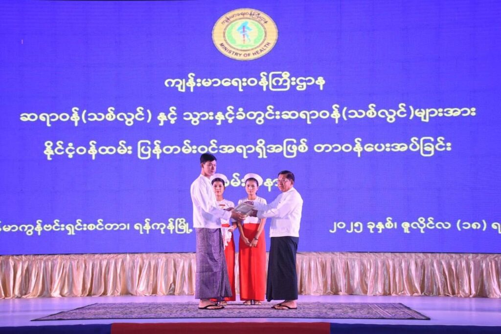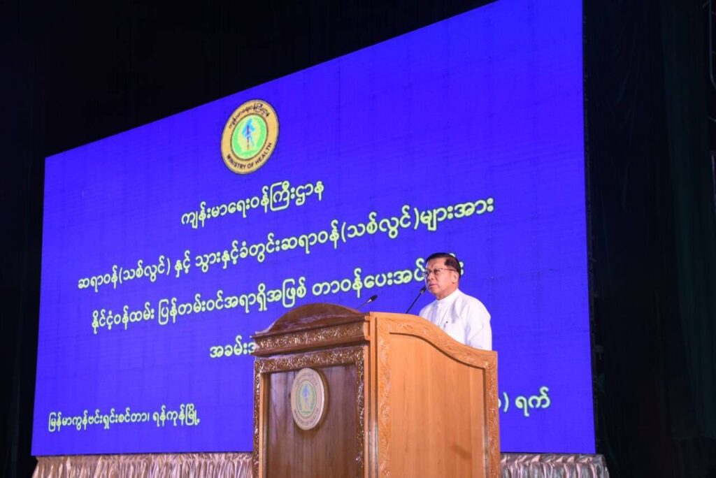 နိုင်ငံတော်စီမံအုပ်ချုပ်ရေးကောင်စီဥက္ကဋ္ဌ နိုင်ငံတော်ဝန်ကြီးချုပ် ဗိုလ်ချုပ်မှူးကြီးမင်းအောင်လှိုင် ကျန်းမာရေးဝန်ကြီးဌာန ဆရာဝန်(သစ်လွင်)များနှင့် သွားနှင့်ခံတွင်း ဆရာဝန်(သစ်လွင်)များအား နိုင်ငံ့ဝန်ထမ်းပြန်တမ်းဝင်အရာရှိအဖြစ် တာဝန်ပေးအပ်ခြင်း ခန့်အပ်လွှာပေးအပ်ပွဲအခမ်းအနားသို့တက်ရောက် အမှာစကားပြောကြား