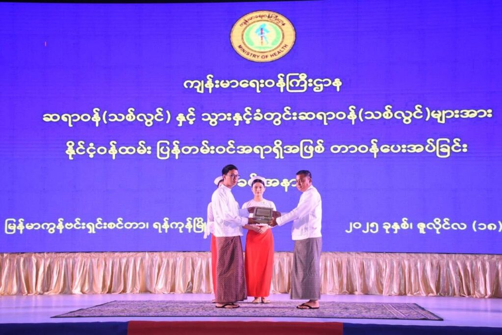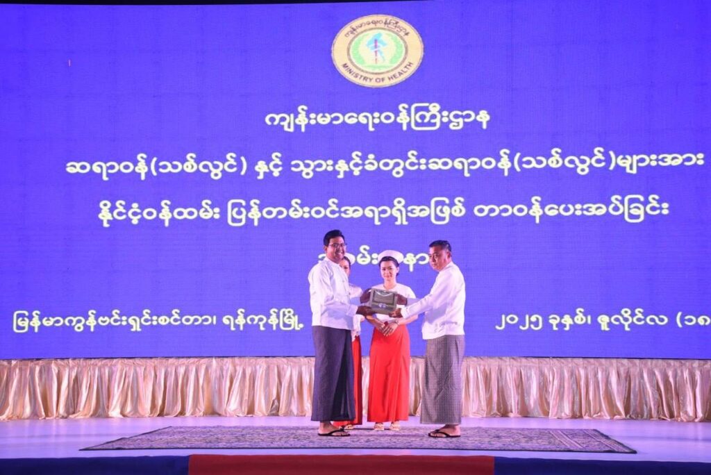 | ဦးစွာ နိုင်ငံတော်စီမံအုပ်ချုပ်ရေးကောင်စီဥက္ကဋ္ဌ နိုင်ငံတော်ဝန်ကြီးချုပ်သည် အခမ်းအနားကျင်းပမည့် မြန်မာကွန်ဗင်းရှင်းစင်တာသို့ရောက်ရှိကြရာ ကျန်းမာရေးဝန်ကြီးဌာန ပြည်ထောင်စုဝန်ကြီး ဒေါက်တာသက်ခိုင်ဝင်းနှင့် ကျန်းမာရေးဝန်ထမ်းများက ကြိုဆိုနှုတ်ဆက်ကြသည်။ယင်းနောက် အခမ်းအနားကို စတင်ကျင်းပပြုလုပ်ရာ ဆေးတက္ကသိုလ်-၁(ရန်ကုန်)မှ ကျောင်းသူများက “မင်္ဂလာပါ” တေးသရုပ်ဖော်သီချင်းဖြင့် ဖျော်ဖြေတင်ဆက်ကြသည်။ | |