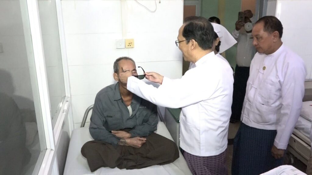 | ထို့နောက် ပြည်သူလူထုအခြေပြု ပဏာမမျက်စိကျန်းမာရေးစောင့်ရှောက်မှုအစီအစဉ်ဖြင့် မျက်စိအတွင်းတိမ်လူနာ (၁၅)ဦးအား တက္ကသိုလ်များဆေးရုံ(ရန်ကုန်)တွင် ဖွင့်လှစ်ထားသည့် မျက်စိခွဲစိတ်ကုသဆောင်၌ ခွဲစိတ်ကုသနေမှုများကို လှည့်လည်ကြည့်ရှုပြီး ရန်ကုန်တိုင်းဒေသကြီး မိခင်နှင့်ကလေးစောင့်ရှောက်မှုကြီးကြပ်ရေးအဖွဲ့နာယက ဒေါ်မော်မော်သန်း၊ ဥက္ကဋ္ဌ ဒေါ်နုနုဆွေနှင့် အဖွဲ့ဝင်များနှင့်အတူ ခွဲစိတ်ပြီးလူနာများအား မျက်မှန်လှူဒါန်းခြင်းနှင့် အာဟာရပြည့်စားသောက် ဖွယ်ရာများလှူဒါန်းခြင်းတို့ကို ဆောင်ရွက်ခဲ့ပါသည်။ ဆက်လက်၍ ပြည်ထောင်စုဝန်ကြီးနှင့်အဖွဲ့သည် တက္ကသိုလ်များဆေးရုံ(ရန်ကုန်)၏ ပြင်ပလူနာဌာန၊ ဓာတ်ခွဲခန်း၊ ခွဲစိတ်ခန်း၊ ဆေးကုသဆောင်နှင့် အထူးကုပြင်ပလူနာဌာန အဆောက် အဦများအား လှည့်လည်ကြည့်ရှုကာ လိုအပ်သည်များ မှာကြားခဲ့ပါသည်။