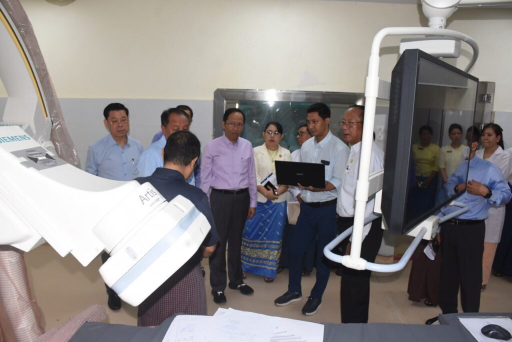 | ထို့နောက် ပြည်ထောင်စုဝန်ကြီးနှင့်အဖွဲ့သည် ရန်ကုန်ပြည်သူ့ဆေးရုံကြီး (၇)ထပ် ဆေးကုသ ဆောင်သို့ ရောက်ရှိပြီး နှလုံးသွေးကြောချဲ့ကုသသည့်စက်အသစ် (Interventional Radiology (IR) X-ray) တပ်ဆင်ထားသည့် အခြေအနေကို ကြည့်ရှုကာ ခိုင်ခံ့မှုအား သေချာစွာအထပ်ထပ် စစ်ဆေးနိုင်ရေး မှာကြားပါသည်။ ထို့နောက်ပြည်ထောင်စုဝန်ကြီးသည် သွေးရောဂါအထူးကုဌာန တွင် ရိုးတွင်းခြင်ဆီ အစားထိုးကုသမှုခံယူရန် ဆေးရုံတက်ရောက်နေသည့် သွေးရောဂါရှင်လူနာ (၂)ဦးအား ကြည့်ရှုအားပေး၍ အာဟာရပြည့်အစားအစာများနှင့် ထောက်ပံ့ငွေများ ပေးအပ်ခဲ့ပါ သည်။ | |