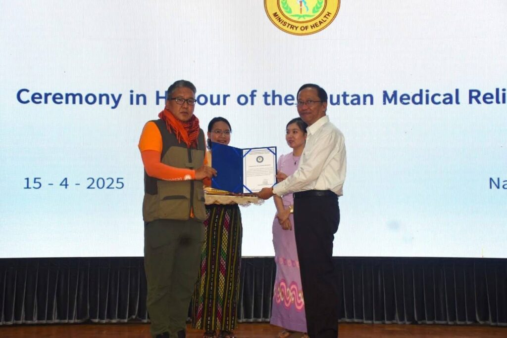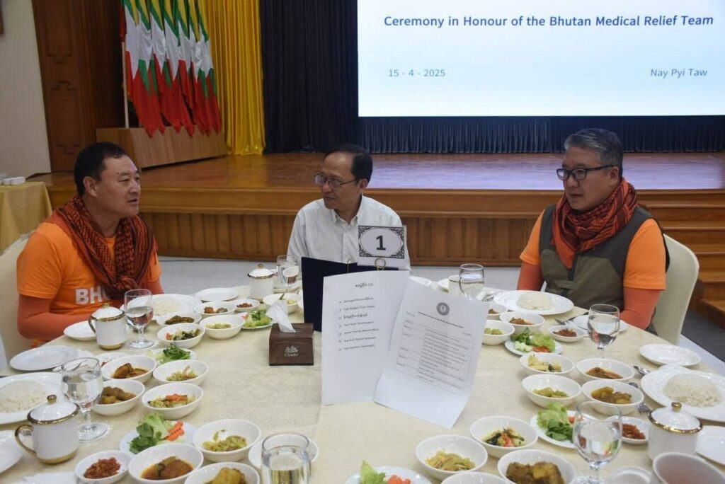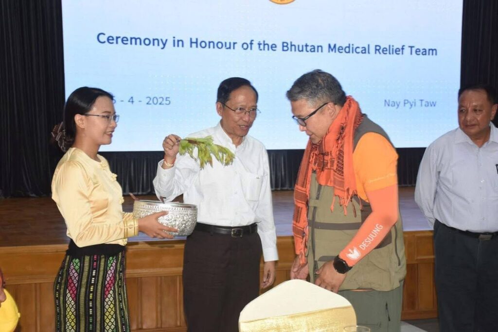 | ရှေးဦးစွာ အခမ်းအနားတက်ရောက်သူများသည် မန္တလေးငလျင်ကြီးတွင်သေဆုံးခဲ့သူများအတွက် ဝမ်းနည်းခြင်းအထိမ်းအမှတ်အဖြစ် မတ်တပ်ရပ်၍ တစ်မိနစ်ငြိမ်သက်စွာနေကြပါသည်။ ဆက်လက် ၍အမျိုးသားသဘာဝဘေးအန္တရာယ်ဆိုင်ရာစီမံခန့်ခွဲမှုကော်မတီဥက္ကဋ္ဌကိုယ်စား အဖွဲ့ဝင်ပြည်ထောင်စုဝန်ကြီးက ဂုဏ်ပြုနှုတ်ဆက်စကားပြောကြားရာတွင် မြန်မာနိုင်ငံ၏ ငလျင်ဘေး တုံ့ပြန်ရေးဆောင်ရွက်ရာတွင် ဘူတန်နိုင်ငံဘုရင်မင်းမြတ်၏ လမ်းညွှန်မှုဖြင့် ဘူတန်နိုင်ငံမှ အရေးပေါ်ဆေး အကူအညီအားရက်ပိုင်းအတွင်းစေလွှတ်၍ နေပြည်တော်ကောင်စီနယ်မြေ၊ ပျဉ်းမနား မြို့နယ်၊ ပေါင်းလောင်းအားကစားကွင်း၊ ပေါင်းလောင်းယာယီဆေးရုံ၌ ဧပြီလ ၁ ရက်နေ့မှ ၁၄ ရက်နေ့အထိ အရေးပေါ်လူနာပေါင်း ၃၀၀၀ ကျော်အား ဆေးကုသမှုနှင့် ခွဲစိတ်ကုသမှုများ ဆောင်ရွက် ပေးခဲ့သည့်အတွက် ထိခိုက်ခံခဲ့ရသည့် မိသားစုများကိုယ်စား ကျေးဇူးတင်ရှိပါကြောင်း၊ ၂၀၂၅ ခုနှစ် ဧပြီလ ၅ ရက်နေ့တွင်ဘန်ကောက်မြို့၌ ကျင်းပသော ဆဋ္ဌမအကြိမ်မြောက် BIMSTEC ထိပ်သီး အစည်းအဝေးတွင် နိုင်ငံတော်ဝန်ကြီးချုပ်သည် ဘူတန်နိုင်ငံဝန်ကြီးချုပ်နှင့်တွေ့ဆုံခဲ့ပြီး ဘူတန်ဘုရင်မင်းမြတ်မှ မြန်မာနိုင်ငံတွင်ငလျင် အကြီးအကျယ်ဖြစ်ပွားမှုအတွက် ဝမ်းနည်းကြောင်းဖော်ပြခဲ့ပြီး ဆေးဘက်ဆိုင်ရာအကူအညီများလျင်မြန်စွာ စေလွှတ်ပေးခဲ့သည့်အတွက် ဘူတန်ဘုရင်မင်းမြတ်၊ ဘူတန်နိုင်ငံအစိုးရနှင့် ပြည်သူများအား ကျေးဇူးတင်ရှိပါကြောင်း၊ မြန်မာနိုင်ငံနှင့် ဘူတန်နိုင်ငံ အစိုးရတို့အကြား ရှေးယခင်ကပင် ဆေးပညာဆိုင်ရာပူးပေါင်းဆောင်ရွက်မှုများရှိခဲ့ပြီး ကျန်းမာရေးဝန်ကြီးဌာန၊ ဆေးတက္ကသိုလ်(၁)၊ ရန်ကုန်တွင် ၁၉၉၅ ခုနှစ်မှ ၂၀၀၀ ပြည့်နှစ်များအထိ ဘူတန်နိုင်ငံမှ ဆေးပညာတော်သင်များ လာရောက်ပညာသင်ကြားခဲ့ကြကာ အထူးကုဆရာဝန်ဘွဲ့များရရှိခဲ့ပါကြောင်း၊ မြန်မာနိုင်ငံမှအထူးကုဆရာဝန် များသည်လည်း ဘူတန်နိုင်ငံတွင် တာဝန်ထမ်းဆောင်နေမှုများရှိပြီး ယခုဆေးအဖွဲ့နှင့်အတူဆေးတက္ကသိုလ်(၁) တွင်ပညာသင်ကြားခဲ့သည့် ဘူတန်နိုင်ငံမှ အထူးကုဆရာဝန်များနှင့် ဘူတန်နိုင်ငံတွင်တာဝန်ထမ်း ဆောင်လျက်ရှိသည့် မြန်မာနိုင်ငံသားဆရာဝန်များပါ လာရောက်၍ ဆေးကုသမှုများပေးခဲ့သည့်အတွက် များစွာဂုဏ်ယူဝမ်းမြောက်ပါကြောင်း၊ ကျန်းမာရေးဝန်ကြီးဌာနအနေဖြင့် နိုင်ငံတော်ဝန်ကြီးချုပ်၏ လမ်းညွှန်မှုနှင့်အညီ ငလျင်ဒဏ်ကြောင့်ထိခိုက်ခံစားရသူများအတွက် ကျန်းမာရေး ဆိုင်ရာ ပြန်လည်ထူထောင်ရေးအတွက်ဆောင်ရွက်လျက်ရှိပါကြောင်း ပြောကြားခဲ့ပါသည်။