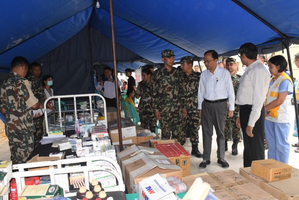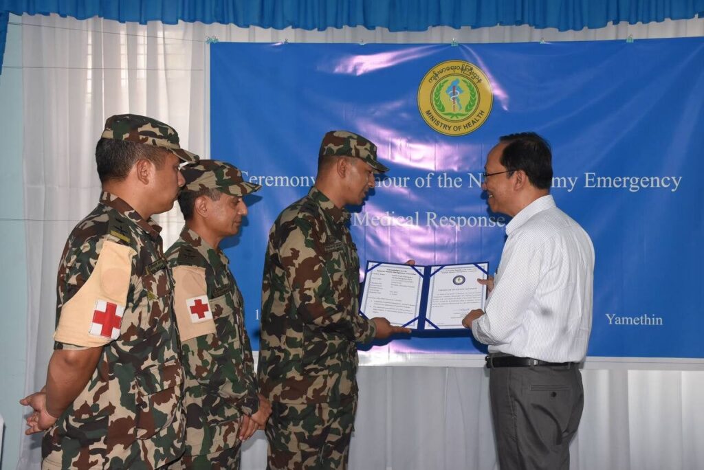 | ဆက်လက်၍ ယနေ့တွင်တာဝန်ပြီးဆုံးပြီဖြစ်သည့် နီပေါတပ်မတော် အရေးပေါ်ဆေးကုသရေးအဖွဲ့အား ဂုဏ်ပြုနှုတ်ဆက်ပွဲ အခမ်းအနားကိုကျင်းပသည်။ ရှေးဦးစွာ အခမ်းအနား တက်ရောက်သူများသည် မန္တလေးငလျင်ကြီးတွင် သေဆုံးခဲ့သူများအတွက် ဝမ်းနည်းခြင်းအထိမ်းအမှတ်အဖြစ် မတ်တတ်ရပ်၍ တစ်မိနစ် ငြိမ်သက်စွာနေကြပါသည်။ ဆက်လက်၍ အမျိုးသားသဘာဝ ဘေးအန္တရာယ်ဆိုင်ရာ စီမံခန့်ခွဲမှုကော်မတီဉက္ကဋ္ဌကိုယ်စား အဖွဲ့ဝင် ပြည်ထောင်စုဝန်ကြီးက ဂုဏ်ပြုနှုတ်ဆက်စကား ပြောကြားရာတွင် နီပေါနိုင်ငံနှင့် မြန်မာနိုင်ငံသည် လူမှုရေး၊ ဘာသာရေး စသည့် အခြေခံအားဖြင့် တူညီမှုများစွာရှိပြီး ယခင်နှစ်ပေါင်းများစွာကတည်းက ရင်းနှီးချစ်ကြည်သည့် ဆက်ဆံရေးနှင့် ပူးပေါင်းဆောင်ရွက်မှုများ ရှိခဲ့ပါကြောင်း၊ ယခုကဲ့သို့ သဘာဝဘေးအန္တရာယ် ကျရောက်ချိန်များတွင်လည်း အပြန်အလှန်ပံ့ပိုးကူညီ ဆောင်ရွက်ခဲ့သည့် မှတ်တမ်းများရှိပါကြောင်း၊ ယခုကဲ့သို့ လာရောက်ပူးပေါင်းဆောင်ရွက်ပေးခြင်းသည် မိမိတို့နှစ်နိုင်ငံအကြား နဂိုရှိခဲ့သည့် ရင်းနှီးချစ်ကြည်မှုများကို ပိုမိုခိုင်မာစွာဖြင့် ရေရှည်တည်တံ့နိုင်ရေး အထောက်အကူဖြစ်စေပါကြောင်း၊ နီပေါနိုင်ငံမှ အရေးပေါ်ဆေးကုသရေးအဖွဲ့သည် (၂-၄-၂၀၂၅) ရက်နေ့ ညနေပိုင်းတွင် နေပြည်တော်သို့ ရောက်ရှိခဲ့ပြီး (၄-၄-၂၀၂၅) ရက်နေ့မှ စတင်ပြီး ကျန်းမာရေးဝန်ကြီးဌာနမှ ဆောင်ရွက်လျက်ရှိသည့် ငလျင်ဘေးအရေးပေါ် ကျန်းမာရေးစောင့်ရှောက်မှုလုပ်ငန်းများကို မန္တလေးတိုင်း ဒေသကြီး၊ ရမည်းသင်းခရိုင်ပြည်သူ့ ဆေးရုံကြီးတွင် အခြေပြုပူးပေါင်းဆောင်ရွက်ခဲ့ကြောင်း၊ ထိုသို့ဆောင်ရွက်ရာတွင် ရက်ပိုင်းအတွင်း လူနာစုစုပေါင်း (၁၀၀၀) ကျော်ကို ဆေးကုသမှုများ၊ ခွဲစိတ်ကုသမှုများ ဆောင်ရွက်ပေးခြင်းနှင့် ချိုင်းထောက်အစရှိသည့် လူနာများအတွက် လိုအပ်သည့်ပစ္စည်းများကို ပံ့ပိုးပေးခဲ့သဖြင့် မြန်မာနိုင်ငံတော်အစိုးရကိုယ်စား၊ ပြည်သူလူထုကိုယ်စား၊ ကျန်းမာရေးဝန်ကြီးဌာနကိုယ်စား၊ ငလျင်ဘေးသင့်ပြည်သူများကိုယ်စား အထူးကျေးဇူး တင်ရှိပါကြောင်း ပြောကြားသည်။ ၎င်းနောက် ပြည်ထောင်စုဝန်ကြီးက နီပေါတပ်မတော် အရေးပေါ်ဆေးကုသရေး အဖွဲ့မှ တာဝန်ရှိသူများအား အမှတ်တရ ဂုဏ်ပြုလက်ဆောင်ပစ္စည်းများ ပေးအပ်သည်။ | |