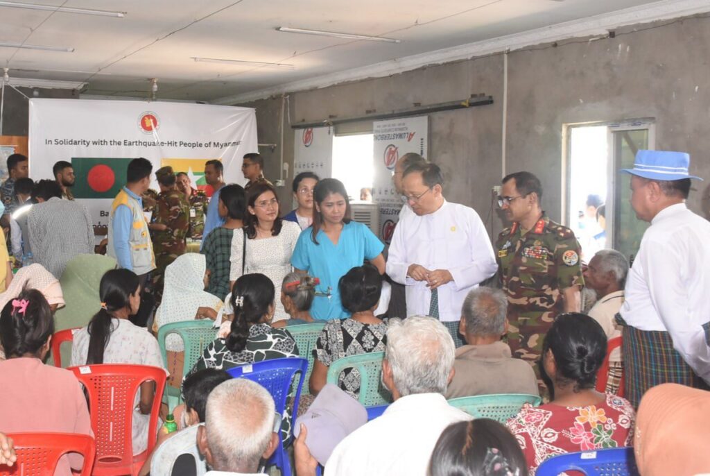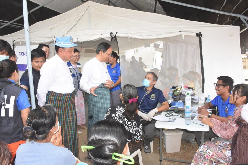 | ဆက်လက်၍ ပြည်ထောင်စုဝန်ကြီးနှင့်အဖွဲ့သည် ပျဉ်းမနားမြို့နယ်၊ ရွာကောက်အုပ်စု၊ မြို့သစ်ရပ်ကွက်တွင်အခြေပြုပြီး ကျန်းမာရေးဝန်ထမ်းများနှင့်ပူးပေါင်း၍ ကျန်းမာရေးစောင့်ရှောက်မှုများ ဆောင်ရွက်နေသည့် ဖိလစ်ပိုင်အရေးပေါ် ဆေးကုသမှုအဖွဲ့နှင့် ပျဉ်းမနားမြို့နယ်၊ ဥယျာဉ်စုအုပ်စု၊ ဦးကျေးရပ်ကွက်၊ မေတ္တာမွန်ခန်းမတွင် ကျန်းမာရေးဝန်ထမ်းများနှင့်ပူးပေါင်း၍ ကျန်းမာရေး စောင့်ရှောက်မှုများဆောင်ရွက်နေသည့် ဘင်္ဂလားဒေ့ရှ် အရေးပေါ်ဆေးအဖွဲ့တို့အားသွားရောက်ကြည့်ရှု၍ လိုအပ်ချက်များကို တာဝန်ရှိသူများနှင့် ညှိနှိုင်းဖြည့်ဆည်းပေးပြီး လူနာများကို ရင်းရင်းနှီးနှီး အားပေးစကားပြောကြားသည်။ အဆိုပါ ဆေးအဖွဲ့များသည် တစ်နေ့လျှင်ပြင်ပလူနာပျမ်းမျှ (၁၅၀)ခန့်အား ကုသပေးလျက်ရှိပါသည်။ ပြည်ထောင်စုဝန်ကြီးသည် လာရောက်ပြသသော လူနာများအား ငလျင်ဘေး အန္တရာယ်ကျရောက်ပြီးနောက် ဖြစ်ပွားတတ်သော ကူးစက်ရောဂါများ ကာကွယ်နိုင်ရန် ကျန်းမာရေးအသိပညာပေးခြင်းများ ဆောင်ရွက်ပါသည်။