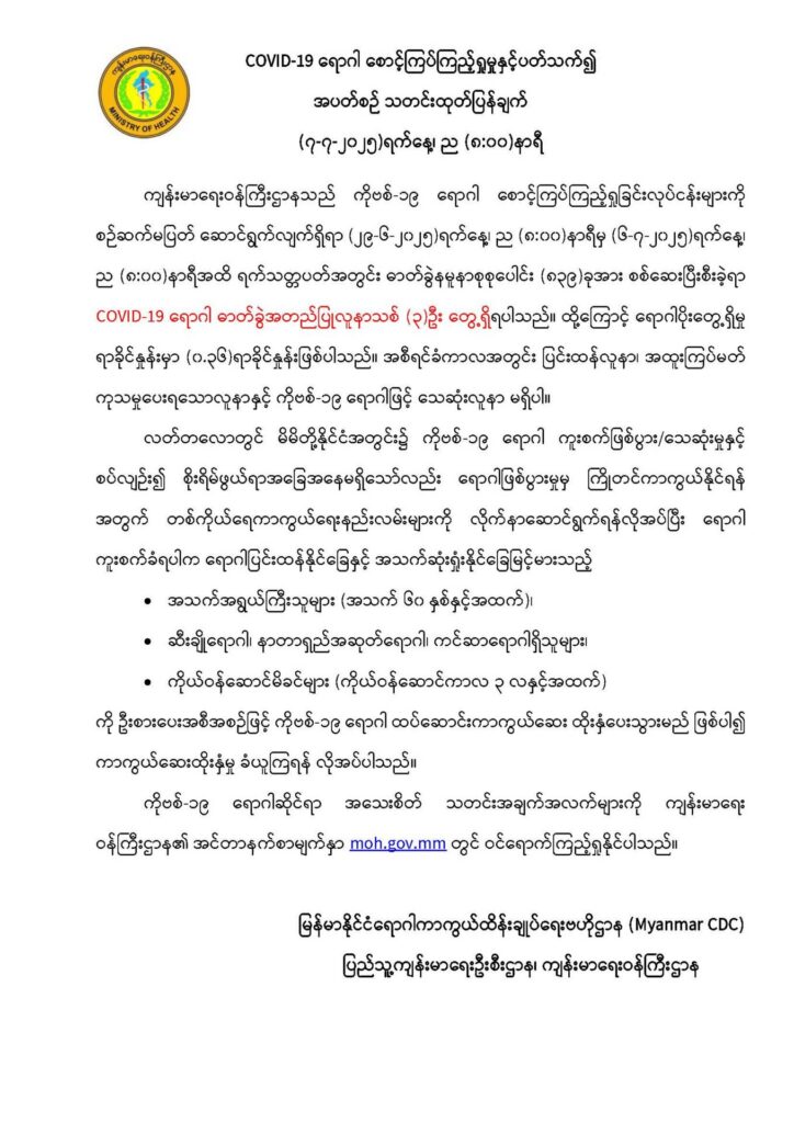 COVID-19 ရောဂါ စောင့်ကြပ်ကြည့်ရှုမှုနှင့်ပတ်သက်၍ အပတ်စဉ်သတင်းထုတ်ပြန်ချက် (၈-၇-၂၀၂၅) ရက်နေ့၊ နံနက် (၈:၀၀) နာရီ