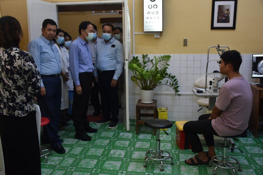 | ထို့နောက် ပြည်ထောင်စုဝန်ကြီးနှင့်အဖွဲ့သည် ညနေပိုင်းတွင် မျက်စိရောဂါအထူးကု ဆေးရုံကြီး၊ ရန်ကုန်သို့ ရောက်ရှိကာ မြေညီထပ်ရှိ ပြင်ပလူနာဌာန၊ အရေးပေါ်ဌာန၊ ဓါတ်ခွဲခန်း၊ ဓါတ်မှန်ခန်း၊ ရေတိမ်ရောဂါအထူးကုစမ်းသပ်ခန်း၊ မျက်စိရောဂါအထူးစမ်းသပ်ခန်းတို့အား ကြည့်ရှုစစ်ဆေးပြီး ဆေးကုသမှုခံယူနိုင်မှုအခြေအနေကို လူနာများအားမေးမြန်းကာ ဌာန အစီအစဉ်ဖြင့် ဆေးဝါးများပံ့ပိုးထားရှိမှု၊ ရောဂါရှာဖွေရေးလုပ်ငန်း စီစဉ်ဆောင်ရွက်ပေးနေမှု၊ လူနာများအနေဖြင့် ကျန်းမာရေးကုန်ကျစရိတ် စိုက်ထုတ်သုံးစွဲရမှုလျှော့ချနိုင်ရေး စီစဉ်ဆောင်ရွက်ထားရှိမှုတို့အား အသိပေးပြောကြားကာ ကျန်းမာရေးဝန်ကြီးဌာနအနေဖြင့် ပိုမိုပံ့ပိုးဆောင်ရွက်နိုင်ရေး မှာကြားခဲ့ပါသည်။ ဆက်လက်၍ ပထမထပ်ရှိ ကလေးမျက်စိ ရောဂါဆိုင်ရာမျက်စိအထူးစမ်းသပ်ခန်း၊ မြင်လွှာနှင့်မျက်စိအထူးစမ်းသပ်ခန်း၊ မျက်ခွံ၊ မျက်ရည်လမ်းကြောင်း၊ မျက်လုံးအိမ်ပိုင်းဆိုင်ရာမျက်စိအထူး စမ်းသပ်ခန်း ၊ မျက်ကြည်လွှာဆိုင်ရာ မျက်စိအထူးစမ်းသပ်ခန်း၊ လေဆာခန်း၊ ဒုတိယထပ်ရှိ အမျိုးသမီးဆောင်၊ သီးသန့်လူနာခန်းများနှင့် တတိယထပ်ရှိ ရန်ကုန်အမျိုးသား မျက်စိဘဏ်တို့အား ကြည့်ရှုစစ်ဆေးခဲ့ပါသည်။ ဆက်လက်၍ ဝန်ထမ်းများနှင့် တွေ့ဆုံကာ ရန်ကုန်အမျိုးသားမျက်စိဘဏ် မျက်ကြည်လွှာလှူဒါန်းမှုပိုမိုရရှိရေး ဆောင်ရွက်ထားမှုအခြေအနေများ၊ မျက်စိခွဲစိတ်မှုလုပ်ငန်းများ ဆောင်ရွက်နေမှု အခြေအနေတို့အား ရန်ကုန်တိုင်းဒေသကြီးကုသရေးဦးစီးဌာနအနေဖြင့် ပံ့ပိုးကူညီဆောင်ရွက်ရန်၊ မျက်တွင်းမှန်ဘီလူးများ ပိုမိုထောက်ပံ့နိုင်ရေး ဆောင်ရွက်ရန် မှာကြားခဲ့ပါသည်။