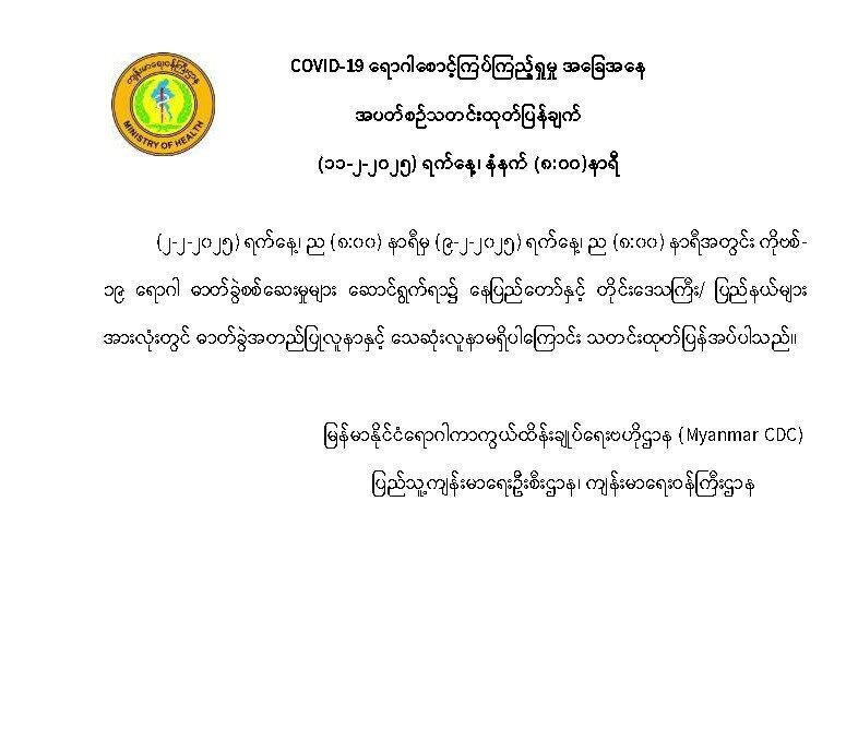 (၂-၂-၂၀၂၅) ရက်နေ့၊ ည (၈:၀၀) နာရီမှ (၉-၂-၂၀၂၅) ရက်နေ့၊ ည (၈:၀၀) နာရီအတွင်း ကိုဗစ်-၁၉ ရောဂါ ဓာတ်ခွဲစစ်ဆေးမှုများ ဆောင်ရွက်ရာ၌ နေပြည်တော်နှင့် တိုင်းဒေသကြီး/ ပြည်နယ်များ အားလုံးတွင် ဓာတ်ခွဲအတည်ပြုလူနာနှင့် သေဆုံးလူနာမရှိပါကြောင်း သတင်းထုတ်ပြန်အပ်ပါသည်။