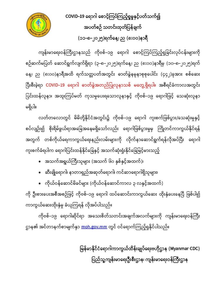 COVID-19 ရောဂါ စောင့်ကြပ်ကြည့်ရှုမှုနှင့်ပတ်သက်၍ အပတ်စဉ်သတင်းထုတ်ပြန်ချက် (၁၂-၈-၂၀၂၅)ရက်နေ့၊ နံနက် (၈:၀၀)နာရီ