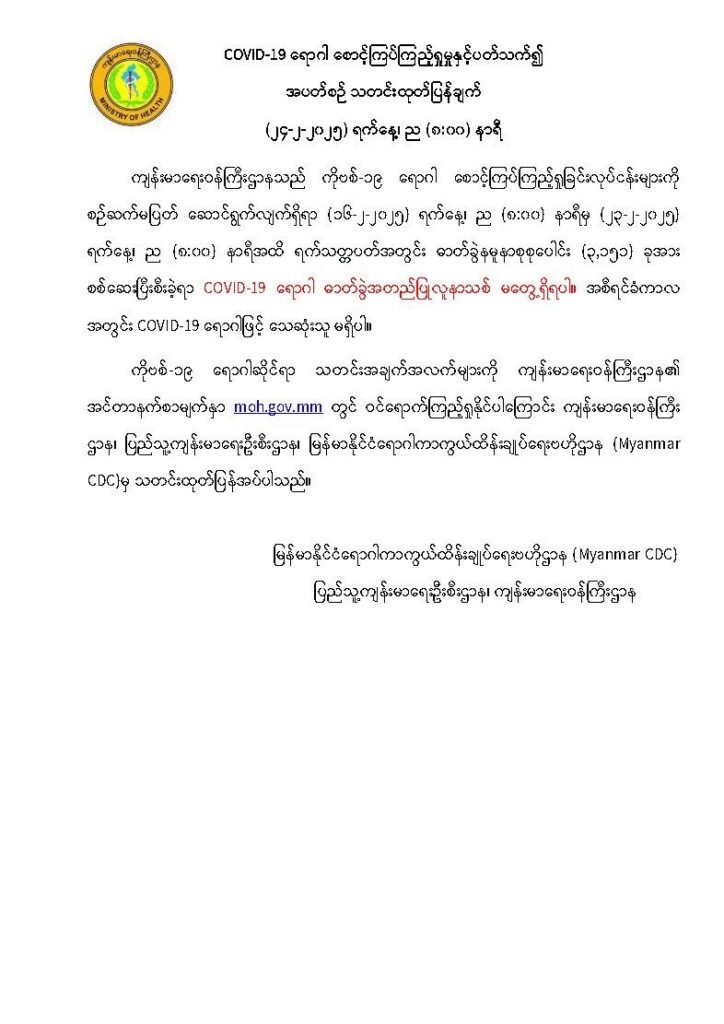 (၁၆-၂-၂၀၂၅) ရက်နေ့၊ ည (၈:၀၀) နာရီမှ (၂၃-၂-၂၀၂၅) ရက်နေ့၊ ည (၈:၀၀) နာရီအထိ ရက်သတ္တပတ်အတွင်း ဓာတ်ခွဲနမူနာစုစုပေါင်း (၃,၁၅၁) ခုအား စစ်ဆေးပြီးစီးခဲ့ရာ COVID-19 ရောဂါ ဓာတ်ခွဲအတည်ပြုလူနာသစ် မတွေ့ရှိရပါ။