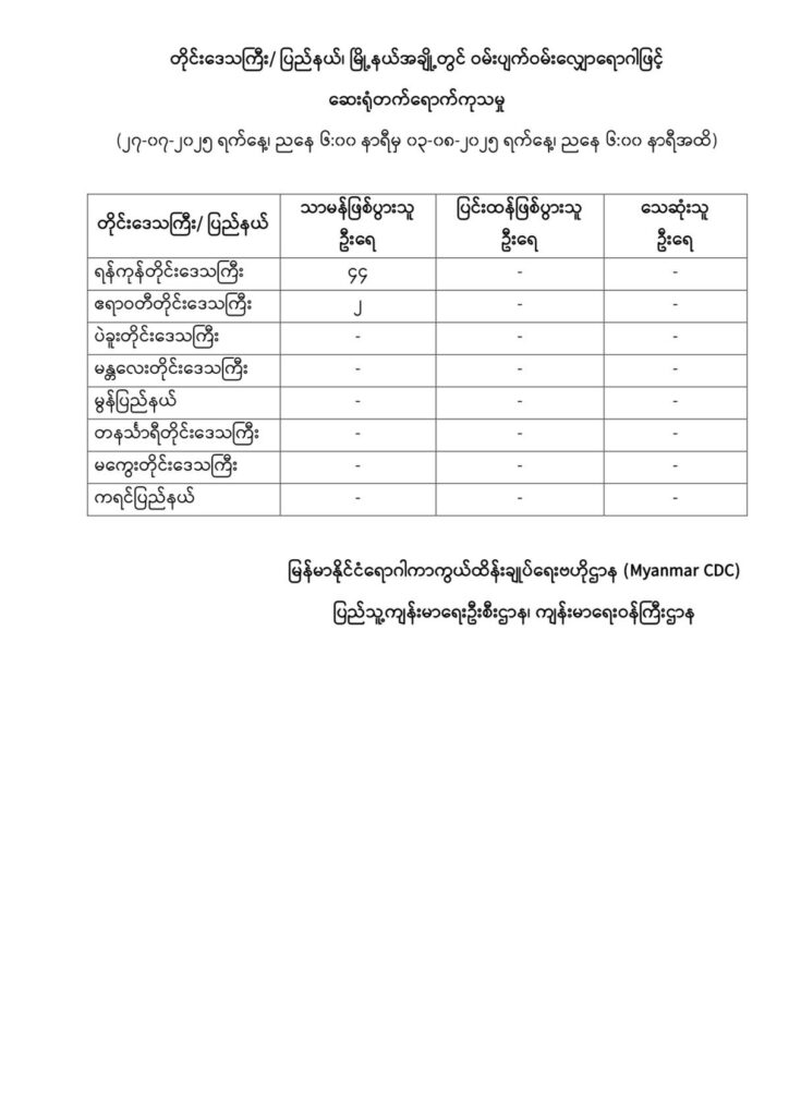 ရန်ကုန်တိုင်းဒေသကြီး၊ ဧရာဝတီတိုင်းဒေသကြီး၊ ပဲခူးတိုင်းဒေသကြီး၊ မန္တလေးတိုင်းဒေသကြီး၊ မွန်ပြည်နယ်၊ တနင်္သာရီတိုင်းဒေသကြီး၊ မကွေးတိုင်းဒေသကြီးနှင့် ကရင်ပြည်နယ်အတွင်းရှိ မြိုနယ်များတွင် ဝမ်းပျက်ဝမ်းလျှောရောဂါဖြင့် ဆေးရုံတက်ရောက်ကုသမှု (၂၇-၇-၂၀၂၅ ရက်နေ့၊ ညနေ ၆:၀၀ နာရီမှ ၃-၈-၂၀၂၅ ရက်နေ့၊ ညနေ ၆:၀၀ နာရီအထိ)