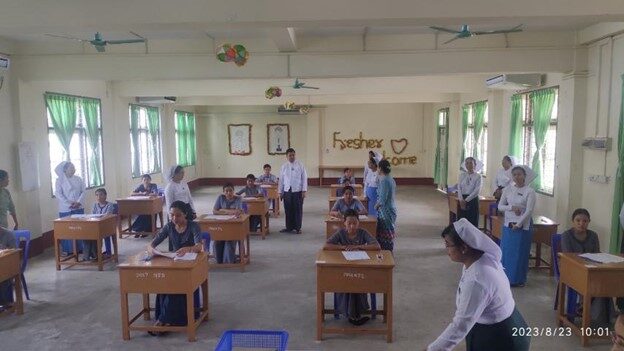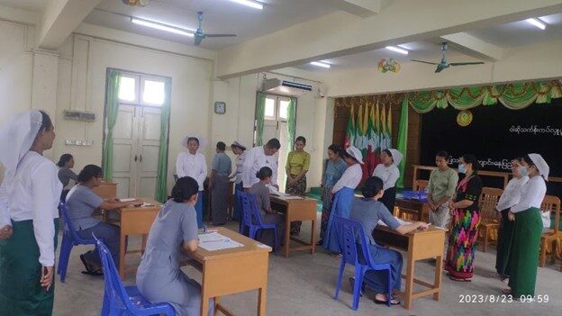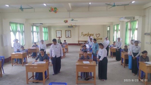 ကျန်းမာရေးလုပ်ငန်းဆိုင်ရာအလုပ်အကိုင်ကျွမ်းကျင်မှု“စံ”သတ်မှတ်ရေးကော်မတီ ဥက္ကဋ္ဌ ကျန်းမာရေးလူ့စွမ်းအားအရင်းအမြစ်ဦးစီးဌာန ညွှန်ကြားရေးမှူးချုပ် မှ အကူသူနာပြု(အဆင့်-၂)အလုပ်အကိုင်အတွက် အမျိုးသားအဆင့်ကျွမ်းကျင်မှုစစ်ဆေးအကဲဖြတ်နေမှုများကို ကြည့်ရှုစစ်ဆေးခြင်း ကျန်းမာရေးဝန်ကြီးဌာန ကျန်းမာရေးလုပ်ငန်းဆိုင်ရာအလုပ်အကိုင်ကျွမ်းကျင်မှု“စံ”သတ်မှတ်ရေးကော်မတီ ဥက္ကဋ္ဌ ကျန်းမာရေးလူ့စွမ်းအားအရင်းအမြစ်ဦးစီးဌာန ညွှန်ကြားရေးမှူးချုပ် မှ အကူသူနာပြု(အဆင့်-၂)အလုပ်အကိုင်အတွက် အမျိုးသားအဆင့်ကျွမ်းကျင်မှုစစ်ဆေးအကဲဖြတ်နေမှုများကို ကြည့်ရှုစစ်ဆေးခြင်း သူနာပြုသင်တန်းကျောင်းနေပြည်တော်၊ ဩဂုတ်လ(၂၃)ရက် ကျန်းမာရေးဝန်ကြီးဌာန ကျန်းမာရေးလုပ်ငန်းဆိုင်ရာအလုပ်အကိုင်ကျွမ်းကျင်မှု“စံ”သတ်မှတ်ရေး ကော်မတီမှ အကူသူနာပြု(အဆင့်-၂)အလုပ်အကိုင်အတွက် အမျိုးသားအဆင့်ကျွမ်းကျင်မှုစစ်ဆေး အကဲဖြတ်ရေးဌာန (Assessment Center) တွင် ကုသရေးဦးစီးဌာနမှ NSSA အသိအမှတ်ပြု အကူသူနာပြု(အဆင့်-၂) သင်ရိုးညွှန်းတမ်းဖြင့် အောင်မြင်ထားသည့် အကူသူနာပြုများအတွက် NSSA အသိအမှတ်ပြု ကျွမ်းကျင်မှုစစ်ဆေးအကဲဖြတ်ဆောင်ရွက်နေခြင်းကို ကျန်းမာရေးလုပ်ငန်းဆိုင်ရာ အလုပ်အကိုင်ကျွမ်းကျင်မှု“စံ”သတ်မှတ်ရေးကော်မတီ ဥက္ကဋ္ဌ၊ ကျန်းမာရေးလူ့စွမ်းအားအရင်းအမြစ်ဦးစီး ဌာန ညွှန်ကြားရေးမှူးချုပ် ဒေါက်တာတင်ထွန်းနှင့် တာဝန်ရှိသူများမှ (၂၃-၈-၂၀၂၃) ရက်နေ့ နံနက်(၉:၄၅)နာရီတွင် သွာရောက်ကြည့်ရှုစစ်ဆေးခဲ့ပါသည်။ ကျွမ်းကျင်မှုစစ်ဆေးအကဲဖြတ်မှုတွင် ပါဝင်သော အကူသူနာပြုလုပ်သား(၁၄)ဦးနှင့် ကုသရေး ဦးစီးဌာနနှင့် ကျန်းမာရေးလူ့စွမ်းအားအရင်းအမြစ်ဦးစီးဌာနမှ On the Job Training (Volunteer Assessor)အဖြစ် ပါဝင်ဆောင်ရွက်သူ သူနာပြု အရာထမ်း/အမှုထမ်း(၃၀)ဦးတို့အား ကျန်းမာရေး လုပ်ငန်းဆိုင်ရာအလုပ်အကိုင်ကျွမ်းကျင်မှု“စံ”သတ်မှတ်ရေးကော်မတီ ဥက္ကဋ္ဌ၊ ကျန်းမာရေးလူ့စွမ်းအား အရင်းအမြစ်ဦးစီးဌာန ညွှန်ကြားရေးမှူးချုပ် ဒေါက်တာတင်ထွန်းမှ တွေ့ဆုံအားပေးစကားပြောကြားခဲ့ ပါသည်။ အဆိုပါ အကူသူနာပြု(အဆင့်-၂)အလုပ်အကိုင်အတွက် ကျွမ်းကျင်မှုစစ်ဆေးအကဲဖြတ်ခြင်းတွင် အကူသူနာပြု(အဆင့်-၂)တစ်ဦး တတ်မြောက်ရမည့် Compentency (၁၁)ခု ပြည့်မီခြင်း ရှိ/မရှိ စာတွေ့လက်တွေ့ဖြင့် အဆင့်ဆင့် စိစစ်အကဲဖြတ်ခြင်းကို (၂၁-၈-၂၀၂၃)ရက်နေ့ မှ (၂၆-၈-၂၀၂၃) ရက်နေ့ထိ ဆောင်ရွက်မည်ဖြစ်ပါကြောင်း သတင်းရရှိပါသည်။