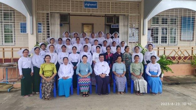 | ကျွမ်းကျင်မှုစစ်ဆေးအကဲဖြတ်မှုတွင် ပါဝင်သော အကူသူနာပြုလုပ်သား(၁၄)ဦးနှင့် ကုသရေး ဦးစီးဌာနနှင့် ကျန်းမာရေးလူ့စွမ်းအားအရင်းအမြစ်ဦးစီးဌာနမှ On the Job Training (Volunteer Assessor)အဖြစ် ပါဝင်ဆောင်ရွက်သူ သူနာပြု အရာထမ်း/အမှုထမ်း(၃၀)ဦးတို့အား ကျန်းမာရေး လုပ်ငန်းဆိုင်ရာအလုပ်အကိုင်ကျွမ်းကျင်မှု“စံ”သတ်မှတ်ရေးကော်မတီ ဥက္ကဋ္ဌ၊ ကျန်းမာရေးလူ့စွမ်းအား အရင်းအမြစ်ဦးစီးဌာန ညွှန်ကြားရေးမှူးချုပ် ဒေါက်တာတင်ထွန်းမှ တွေ့ဆုံအားပေးစကားပြောကြားခဲ့ ပါသည်။ | |