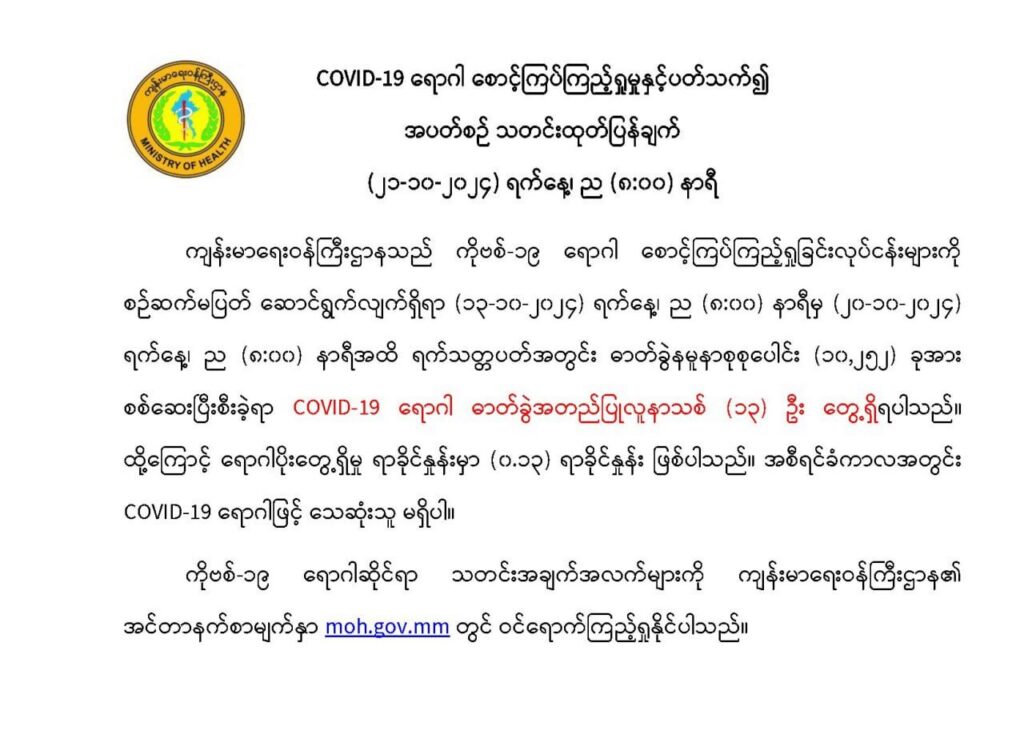 (၁၃-၁၀-၂၀၂၄) ရက်နေ့၊ ည (၈:၀၀) နာရီမှ (၂၀-၁၀-၂၀၂၄) ရက်နေ့၊ ည (၈:၀၀) နာရီအထိ ရက်သတ္တပတ်အတွင်း ဓာတ်ခွဲနမူနာစုစုပေါင်း (၁၀,၂၅၂) ခုအား စစ်ဆေးပြီးစီးခဲ့ရာ COVID-19 ရောဂါ ဓာတ်ခွဲအတည်ပြုလူနာသစ် (၁၃) ဦး တွေ့ရှိရပါသည်။ ထို့ကြောင့် ရောဂါပိုးတွေ့ရှိမှု ရာခိုင်နှုန်းမှာ (၀.၁၃) ရာခိုင်နှုန်း ဖြစ်ပါသည်။