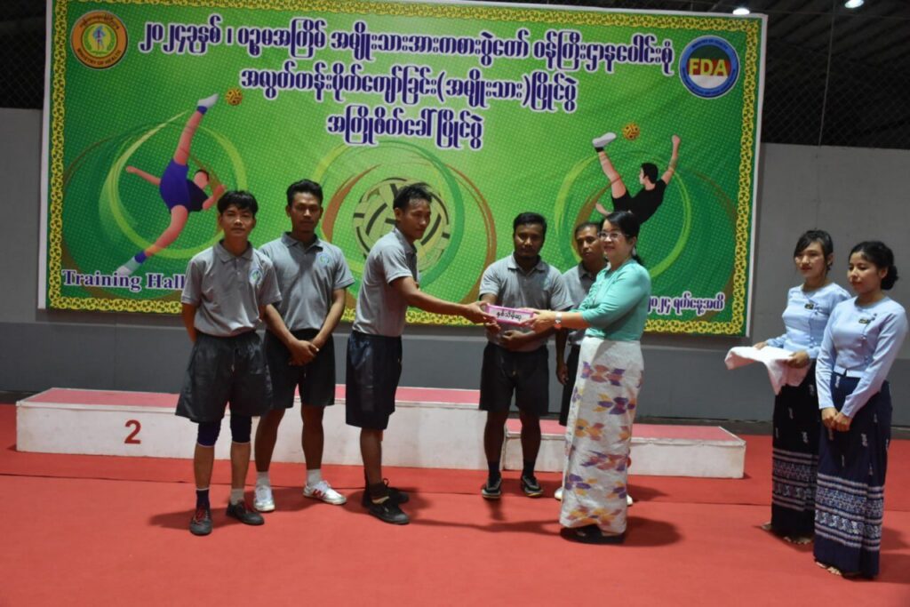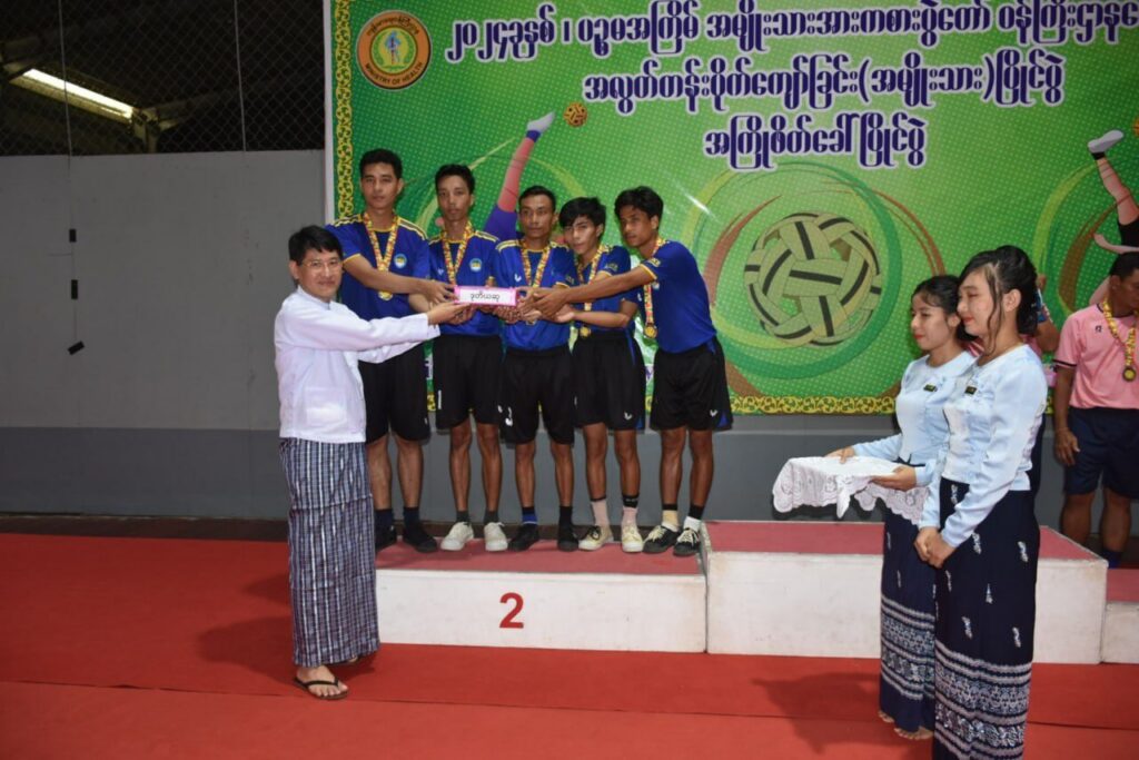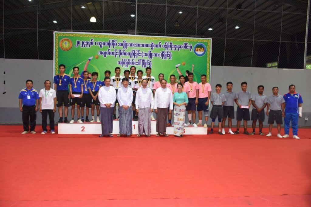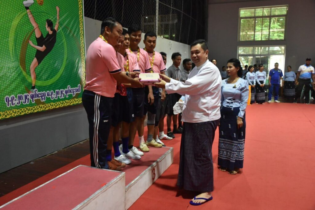 | ယင်းနောက် ဆုချီးမြှင့်ပွဲအခမ်းအနားကို ဆက်လက်ကျင်းပရာ ကျန်းမာရေးဝန်ကြီးဌာန ပြည်ထောင်စုဝန်ကြီး ပါမောက္ခဒေါက်တာသက်ခိုင်ဝင်းက ပထမဆုရအသင်းအား ဂုဏ်ပြုဆုနှင့် ချီးမြှင့်ငွေများကိုလည်းကောင်း၊ ကျန်းမာရေးဝန်ကြီးဌာနမှ ညွှန်ကြားရေးမှူးချုပ်များက ဒုတိယဆုနှင့် တတိယဆုရအသင်းများအား ဂုဏ်ပြုဆုနှင့် ချီးမြှင့်ငွေများကိုလည်းကောင်း၊ နှစ်သိမ့်ဆုရအသင်းအား ချီးမြှင့်ငွေကိုလည်းကောင်း အသီးသီးချီးမြှင့်ပေးအပ်ခဲ့ကြပြီး ပြည်ထောင်စုဝန်ကြီးနှင့် တာဝန်ရှိသူများသည် ပြိုင်ပွဲဝင်အသင်းများအား ရင်းရင်းနှီးနှီး တွေ့ဆုံ နှုတ်ဆက်ခဲ့ပါသည်။ | |