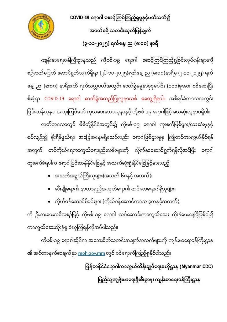COVID-19 ရောဂါ စောင့်ကြပ်ကြည့်ရှုမှုနှင့်ပတ်သက်၍ အပတ်စဉ်သတင်းထုတ်ပြန်ချက် (၃-၁၁-၂၀၂၅)ရက်နေ့၊ ည (၈:၀၀)နာရီ