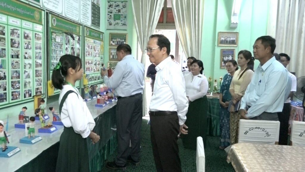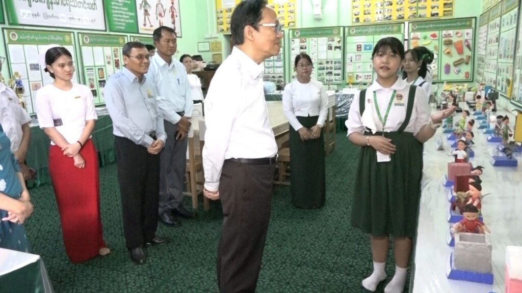 | ယင်းနောက် အ.လ.က (၁)၊ဒဂုံမှ အလယ်တန်းကျောင်းသူလေးများက ကျောင်းကျန်းမာရေးပြခန်းတွင် ခင်းကျင်းပြသထားသည့် ကျန်းမာရေးအသိပညာပေးပြခန်းငယ် (၉) ခုကို ရှင်းလင်းပြသခဲ့မှုကို ကြည့်ရှုအားပေးကာ ပြည်ထောင်စုဝန်ကြီးနှင့်အဖွဲ့သည် မရမ်းကုန်းမြို့နယ်ရှိ အ.ထ.က (၅)၊မရမ်းကုန်းတွင် တက်ရောက်နေသော KG ကျောင်းသား၊ကျောင်းသူများအား ကျောင်းတွင်းအာဟာရကျွေးမွေးခြင်းကို ကြည့်ရှုအားပေး ခဲ့ကြပါသည်။ | |