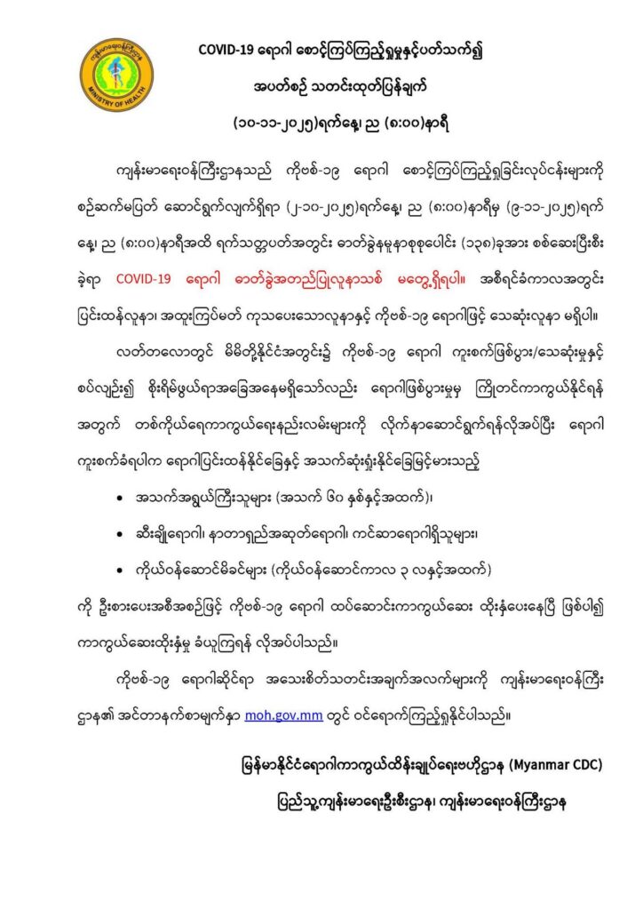 COVID-19 ရောဂါ စောင့်ကြပ်ကြည့်ရှုမှုနှင့်ပတ်သက်၍ အပတ်စဉ်သတင်းထုတ်ပြန်ချက် (၁၀-၁၁-၂၀၂၅)ရက်နေ့၊ ည (၈:၀၀)နာရီ