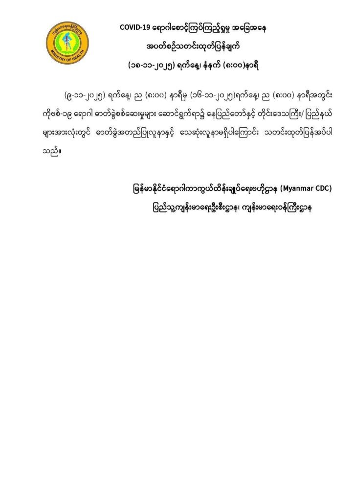 COVID-19 ရောဂါ စောင့်ကြပ်ကြည့်ရှုမှုနှင့်ပတ်သက်၍ အပတ်စဉ်သတင်းထုတ်ပြန်ချက် (၁၈-၁၁-၂၀၂၅)ရက်နေ့၊ နံနက် (၈:၀၀)နာရီ