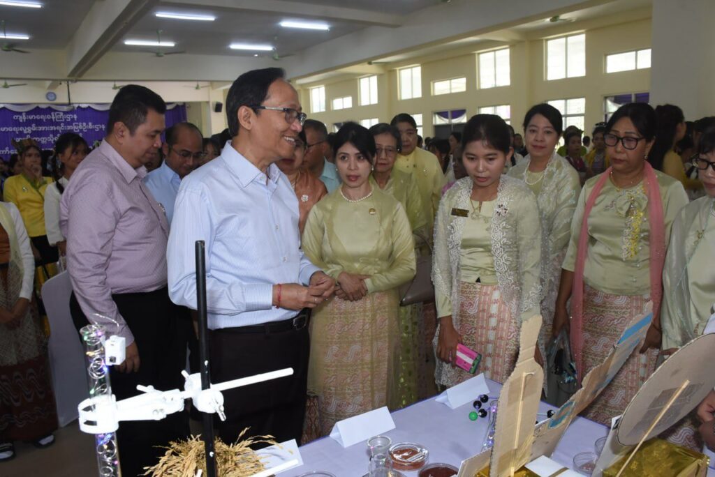 | ထို့နောက် ကျောင်းသား ကျောင်းသူများ သုတေသနပြု ဖော်စပ်ထုတ်လုပ်ထားသောဆေးဝါးများ၊ အလှကုန်ပစ္စည်းများ ခင်းကျင်းပြထားခြင်းနှင့် သုတေသနစာတမ်းများကို လှည့်လည်ကြည့်ရှု အားပေးခဲ့သည်။