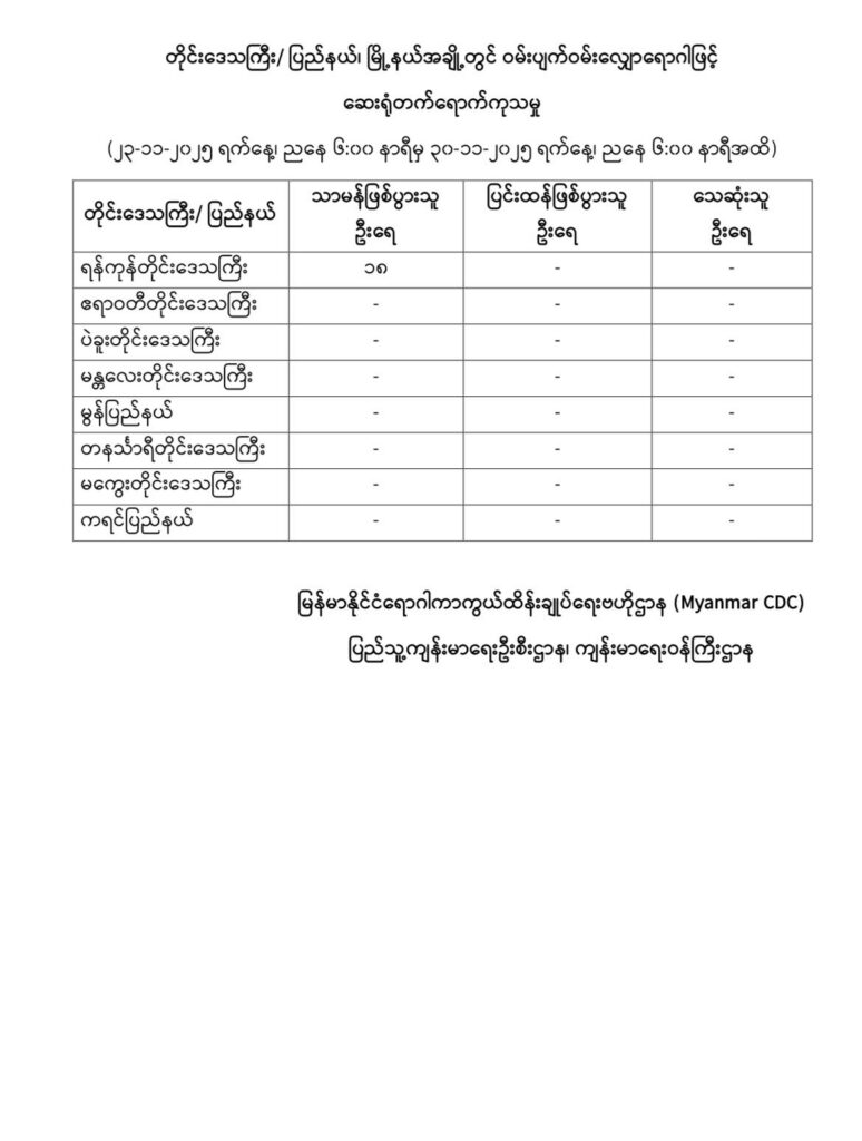 ရန်ကုန်တိုင်းဒေသကြီး၊ ဧရာဝတီတိုင်းဒေသကြီး၊ ပဲခူးတိုင်းဒေသကြီး၊ မန္တလေးတိုင်းဒေသကြီး၊ မွန်ပြည်နယ်၊ တနင်္သာရီတိုင်းဒေသကြီး၊ မကွေးတိုင်းဒေသကြီးနှင့် ကရင်ပြည်နယ်အတွင်းရှိ မြိုနယ်များတွင် ဝမ်းပျက်ဝမ်းလျှောရောဂါဖြင့် ဆေးရုံတက်ရောက်ကုသမှု (၂၃-၁၁-၂၀၂၅ ရက်နေ့၊ ညနေ ၆:၀၀ နာရီမှ ၃၀-၁၁-၂၀၂၅ ရက်နေ့၊ ညနေ ၆:၀၀ နာရီအထိ)