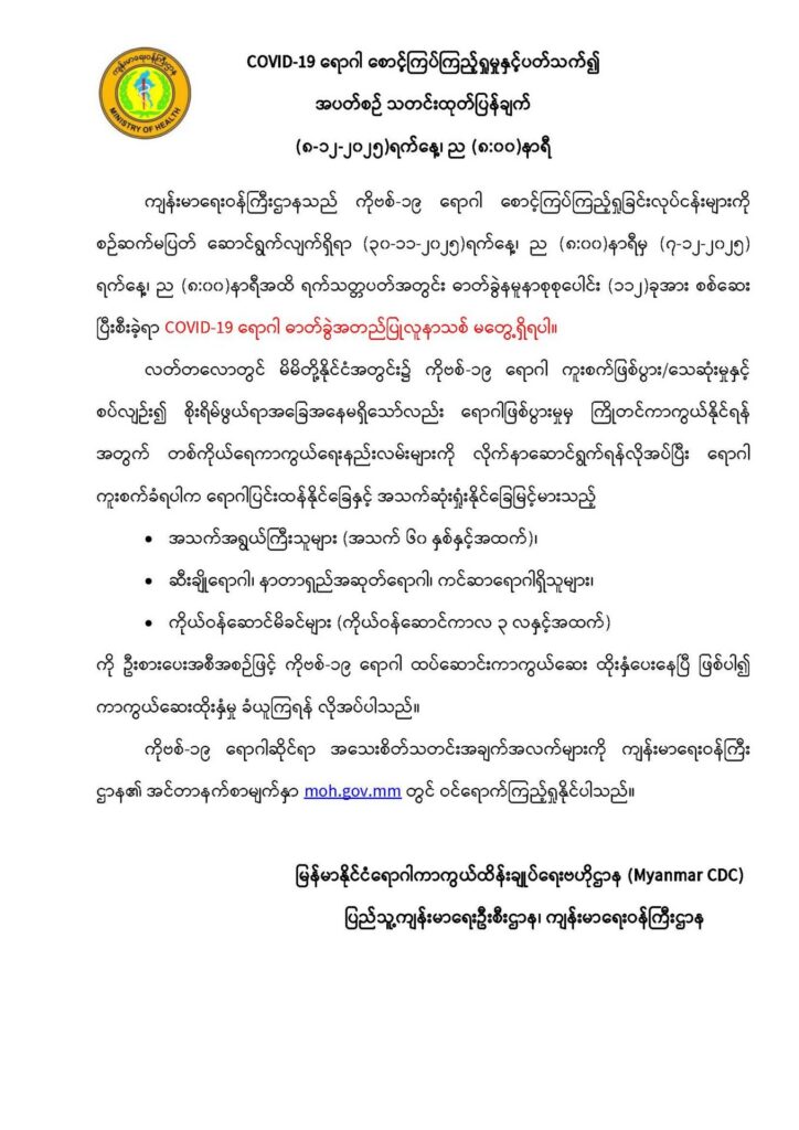 COVID-19 ရောဂါ စောင့်ကြပ်ကြည့်ရှုမှုနှင့်ပတ်သက်၍ အပတ်စဉ်သတင်းထုတ်ပြန်ချက် (၈-၁၂-၂၀၂၅)ရက်နေ့၊ ည (၈:၀၀)နာရီ