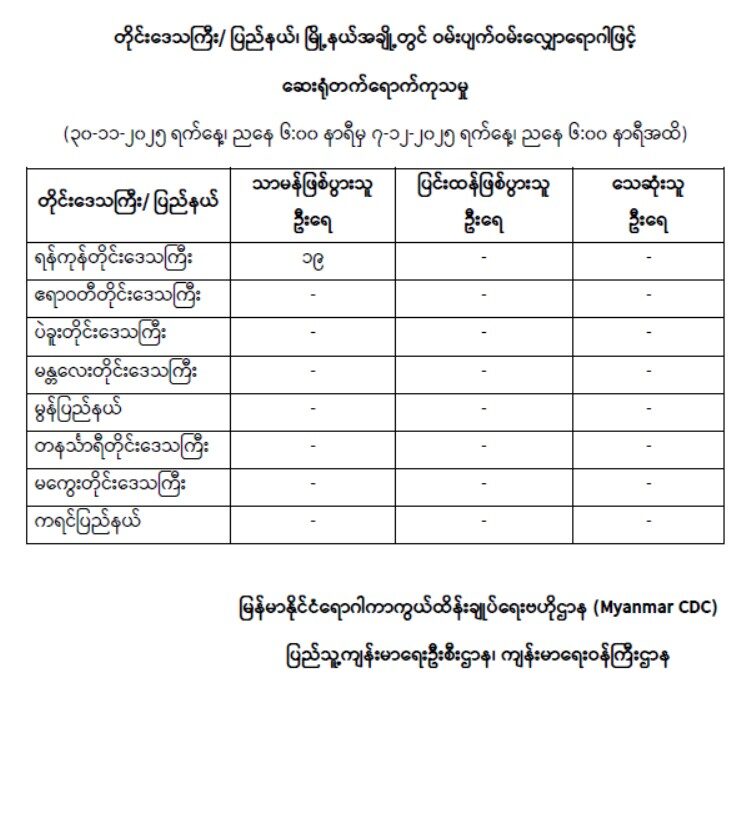 ရန်ကုန်တိုင်းဒေသကြီး၊ ဧရာဝတီတိုင်းဒေသကြီး၊ ပဲခူးတိုင်းဒေသကြီး၊ မန္တလေးတိုင်းဒေသကြီး၊ မွန်ပြည်နယ်၊ တနင်္သာရီတိုင်းဒေသကြီး၊ မကွေးတိုင်းဒေသကြီးနှင့် ကရင်ပြည်နယ်အတွင်းရှိ မြို့နယ်များတွင် ဝမ်းပျက်ဝမ်းလျှောရောဂါဖြင့် ဆေးရုံတက်ရောက်ကုသမှု (၃၀-၁၁-၂၀၂၅ ရက်နေ့၊ ညနေ ၆:၀၀ နာရီမှ ၇-၁၂-၂၀၂၅ ရက်နေ့၊ ညနေ ၆:၀၀ နာရီအထိ)