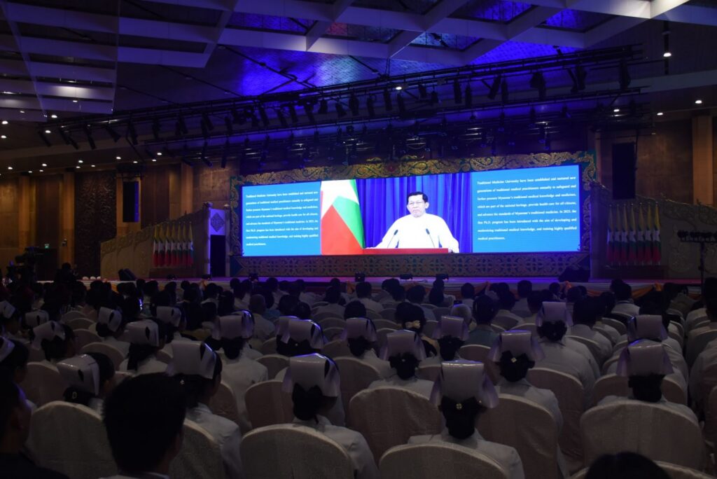 ဆက်လက်၍ ပြည်ထောင်စုသမ္မတ မြန်မာနိုင်ငံတော် ယာယီသမ္မတ နိုင်ငံတော်လုံခြုံရေးနှင့် အေးချမ်းသာယာရေးကော်မရှင် ဥက္ကဋ္ဌ ဗိုလ်ချုပ်မှူးကြီး မင်းအောင်လှိုင်က တိုင်းရင်းဆေးသမားတော်များ ညီလာခံနှင့် မြန်မာ့တိုင်းရင်းဆေးပညာ နှီးနှောဖလှယ်ပွဲ သို့ ပေးပို့သည့် ဂုဏ်ပြုမိန့်ခွန်း Vedio Message ကို ဖွင့်လှစ်ပြသသည်။ |
