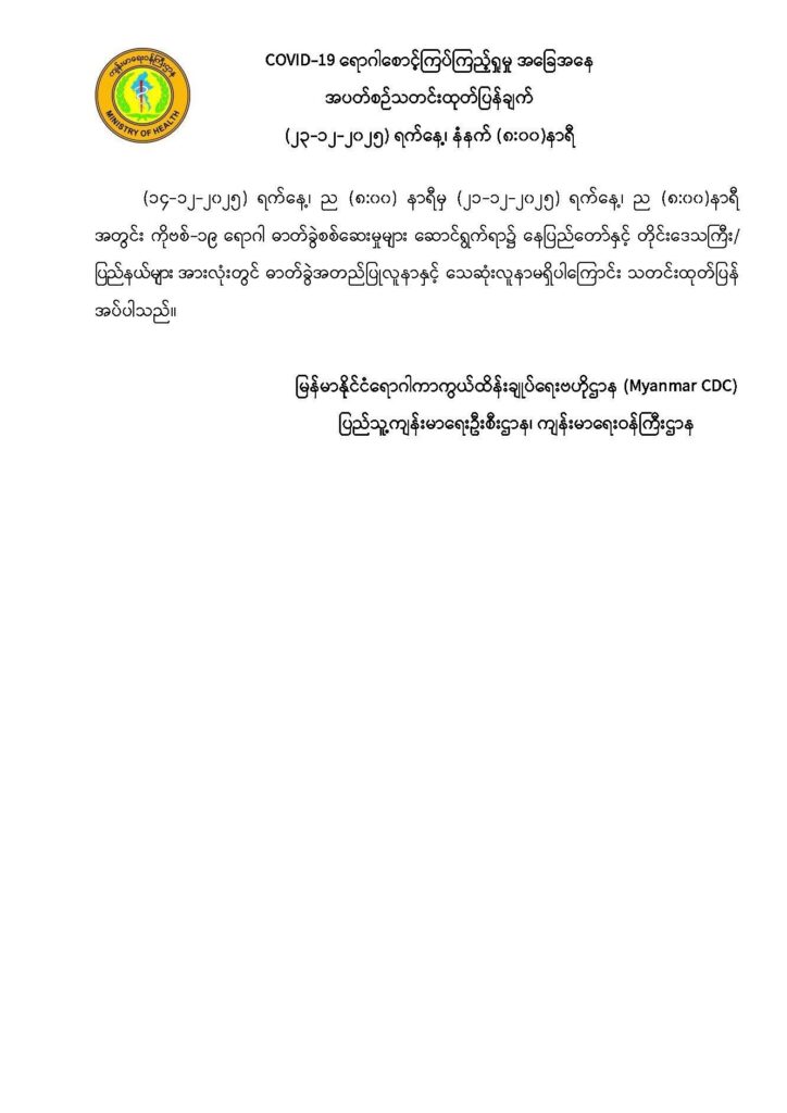 COVID-19 ရောဂါ စောင့်ကြပ်ကြည့်ရှုမှုနှင့်ပတ်သက်၍ အပတ်စဉ်သတင်းထုတ်ပြန်ချက် (၂၃-၁၂-၂၀၂၅)ရက်နေ့၊ နံနက် (၈:၀၀)နာရီ