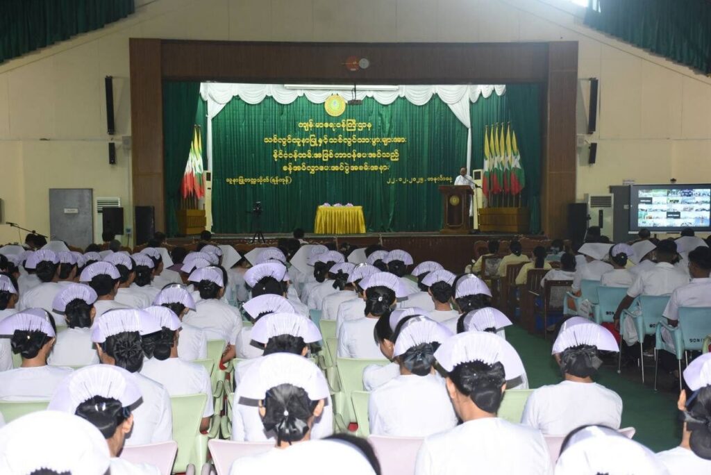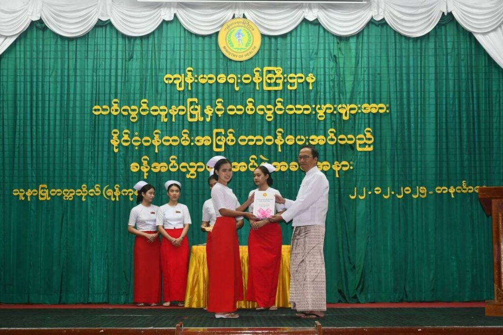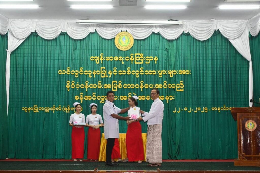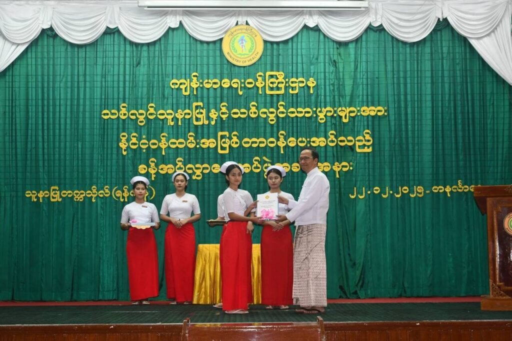 နေပြည်တော်၊ (၂၀၂၅) ခုနှစ်၊ ဒီဇင်ဘာလ (၂၂)ရက် ကျန်းမာရေးဝန်ကြီးဌာနမှ သူနာပြု-သားဖွား ဒီပလိုမာ(၃)နှစ် သင်တန်းဆင်းမည့် သစ်လွင် သူနာပြုများနှင့် သားဖွားဒီပလိုမာ(၂) နှစ် သင်တန်းဆင်းမည့် သစ်လွင်သားဖွားများကို နိုင်ငံ့ဝန်ထမ်းအဖြစ် တာဝန်ပေးအပ်သည့် ခန့်အပ်လွှာ ပေးအပ်ပွဲကို (၂၂-၁၂-၂၀၂၅) ရက်နေ့နံနက်ပိုင်းတွင် သူနာပြုတက္ကသိုလ်(ရန်ကုန်)၊ Auditorium ခန်းမ၌ Hybrid စနစ်ဖြင့် ကျင်းပရာကျန်းမာရေးဝန်ကြီးဌာန ပြည်ထောင်စုဝန်ကြီး ပါမောက္ခဒေါက်တာ သက်ခိုင်ဝင်း၊ ရန်ကုန်တိုင်းဒေသကြီးအစိုးရအဖွဲ့ဝန်ကြီးချုပ် ဦးစိုးသိန်း၊ မြန်မာနိုင်ငံသူနာပြုနှင့်သားဖွားကောင်စီဥက္ကဋ္ဌ၊ ဌာနဆိုင်ရာတာဝန်ရှိသူများ၊ သစ်လွင် သူနာပြုများနှင့် သစ်လွင်သားဖွားများ တက်ရောက်ကြသည်။ |
