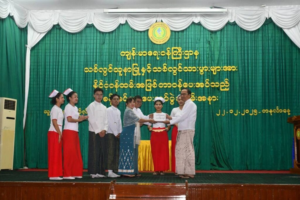 | ထို့နောက် တိုင်းဒေသကြီးဝန်ကြီးချုပ်က ရန်ကုန်ရှိ သူနာပြု သင်တန်း ကျောင်း(၆)ကျောင်း၊ သားဖွားသင်တန်းကျောင်း(၁)ကျောင်းတို့အတွက် ဂုဏ်ပြုချီးမြှင့်ငွေကျပ် သိန်း(၃၅၀)အား ပေးအပ်ခဲ့ရာ ပြည်ထောင်စုဝန်ကြီးက လက်ခံရယူပြီး တေးသရုပ်ဖော်အကအဖွဲ့များကို ဂုဏ်ပြုဆုငွေများ ပေးအပ်သည်။