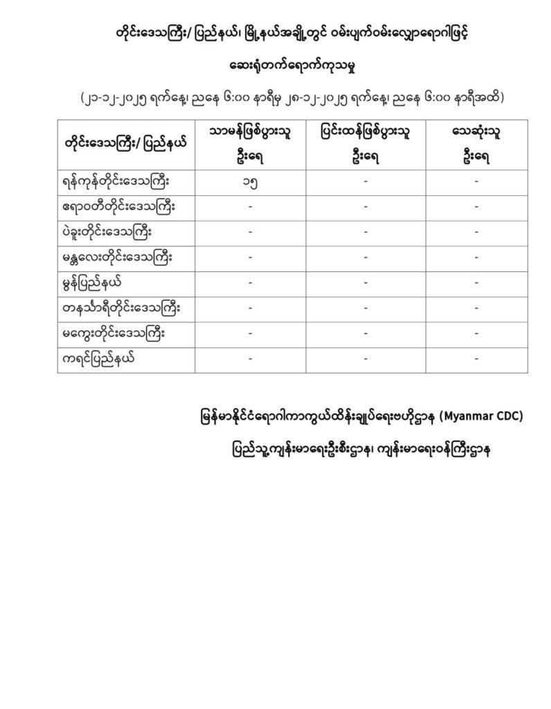 ရန်ကုန်တိုင်းဒေသကြီး၊ ဧရာဝတီတိုင်းဒေသကြီး၊ ပဲခူးတိုင်းဒေသကြီး၊ မန္တလေးတိုင်းဒေသကြီး၊ မွန်ပြည်နယ်၊ တနင်္သာရီတိုင်းဒေသကြီး၊ မကွေးတိုင်းဒေသကြီးနှင့် ကရင်ပြည်နယ်အတွင်းရှိ မြိုနယ်များတွင် ဝမ်းပျက်ဝမ်းလျှောရောဂါဖြင့် ဆေးရုံတက်ရောက်ကုသမှု (၂၁-၁၂-၂၀၂၅ ရက်နေ့၊ ညနေ ၆:၀၀ နာရီမှ ၂၈-၁၂-၂၀၂၅ ရက်နေ့၊ ညနေ ၆:၀၀ နာရီအထိ)