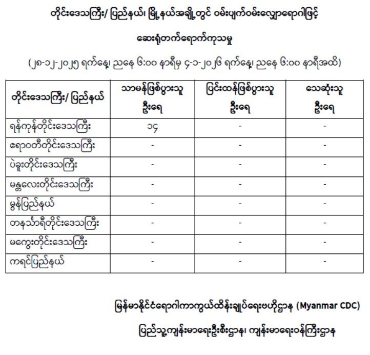 ရန်ကုန်တိုင်းဒေသကြီး၊ ဧရာဝတီတိုင်းဒေသကြီး၊ ပဲခူးတိုင်းဒေသကြီး၊ မန္တလေးတိုင်းဒေသကြီး၊ မွန်ပြည်နယ်၊ တနင်္သာရီတိုင်းဒေသကြီး၊ မကွေးတိုင်းဒေသကြီးနှင့် ကရင်ပြည်နယ်အတွင်းရှိ မြိုနယ်များတွင် ဝမ်းပျက်ဝမ်းလျှောရောဂါဖြင့် ဆေးရုံတက်ရောက်ကုသမှု (၂၈-၁၂-၂၀၂၅ ရက်နေ့၊ ညနေ ၆:၀၀ နာရီမှ ၄-၁-၂၀၂၆ ရက်နေ့၊ ညနေ ၆:၀၀ နာရီအထိ)
