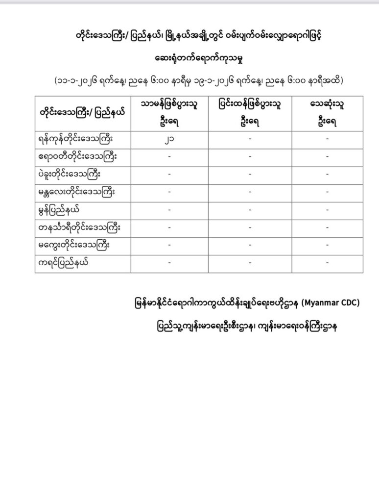 ရန်ကုန်တိုင်းဒေသကြီး၊ ဧရာဝတီတိုင်းဒေသကြီး၊ ပဲခူးတိုင်းဒေသကြီး၊ မန္တလေးတိုင်းဒေသကြီး၊ မွန်ပြည်နယ်၊ တနင်္သာရီတိုင်းဒေသကြီး၊ မကွေးတိုင်းဒေသကြီးနှင့် ကရင်ပြည်နယ်အတွင်းရှိ မြိုနယ်များတွင် ဝမ်းပျက်ဝမ်းလျှောရောဂါဖြင့် ဆေးရုံတက်ရောက်ကုသမှု (၁၁-၁-၂၀၂၆ ရက်နေ့၊ ညနေ ၆:၀၀ နာရီမှ ၁၉-၁-၂၀၂၆ ရက်နေ့၊ ညနေ ၆:၀၀ နာရီအထိ)