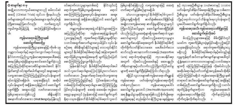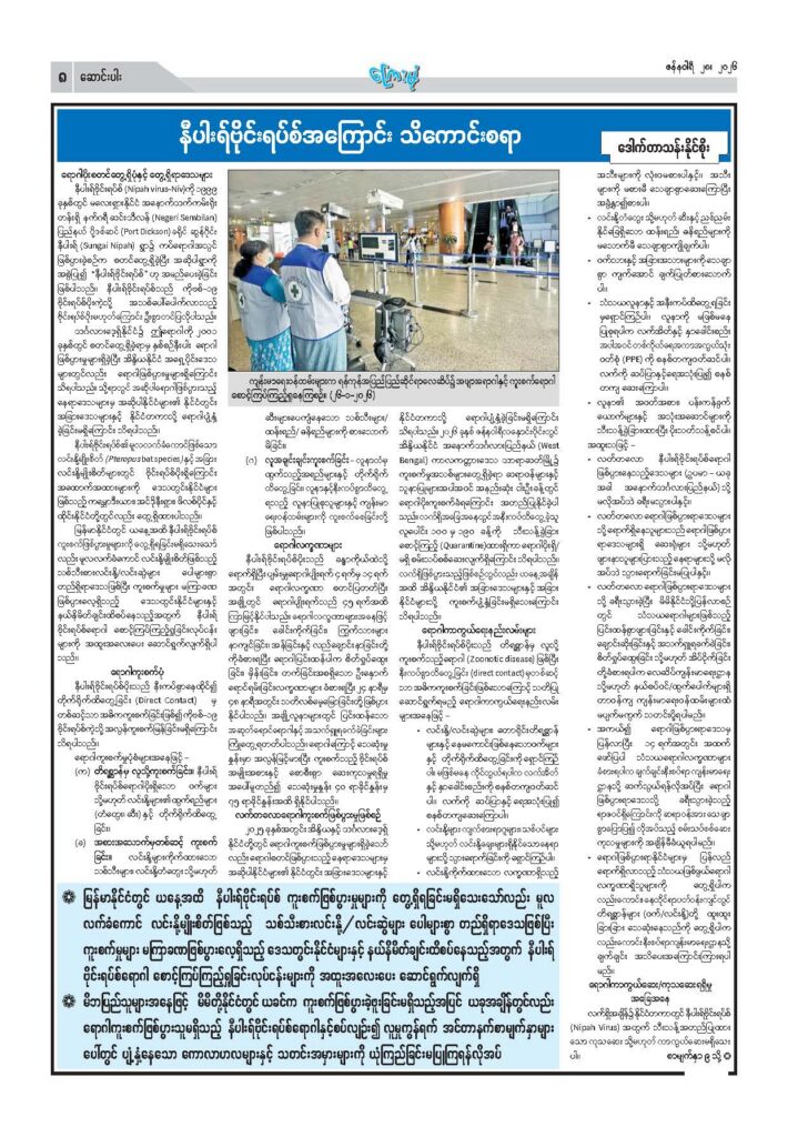မိဘပြည်သူများအနေဖြင့် မိမိတို့နိုင်ငံတွင် ယခင်က ကူးစက်ဖြစ်ပွားခဲ့ဖူးခြင်းမရှိသည့် အပြင် ယခုအချိန်တွင်လည်း ရောဂါကူးစက်ဖြစ်ပွားသူမရှိသည့် နီပါးရ်ဗိုင်းရပ်စ်ရောဂါနှင့် စပ်လျဉ်း၍ လူမှုကွန်ရက် အင်တာနက်စာမျက်နှာများပေါ်တွင် ပျံ့နှံ့နေသော ကောလာဟလ များနှင့် သတင်းအမှားများကို ယုံကြည်ခြင်း မပြုကြရန်လိုအပ်ပါသည်။ အဆိုပါရောဂါနှင့် ပတ်သက်၍ အလွန်အမင်း စိုးရိမ်ကြောင့်ကြခြင်းမရှိဘဲ ကျန်းမာရေးဝန်ကြီးဌာန၏ တရားဝင် အသိပေးနှိုးဆော်ချက်များနှင့် အချိန်နှင့်တစ်ပြေးညီဆောင်ရွက်ပေးလျက်ရှိသည့် သတင်းထုတ် ပြန်ချက်များကိုသာ ကျန်းမာရေးအသိ၊ ကျန်းမာရေးသတိရှိစွာဖြင့် လိုက်နာကြပါရန် တိုက်တွန်း လိုက်ရပါသည်။
