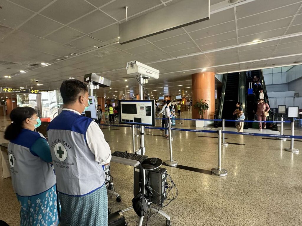 ကျန်းမာရေးဝန်ကြီးဌာနအနေဖြင့် ကိုဗစ်-၁၉ ကမ္ဘာ့ကပ်ရောဂါနှင့် မျောက်ကျောက်ရောဂါ စသည့် နိုင်ငံတကာပြည်သူ့ကျန်းမာရေးအရေးပေါ်အခြေအနေ ဖြစ်ပွားခဲ့ချိန်များမှစတင် ဆောင်ရွက်ခဲ့သည့် အပြည်ပြည်ဆိုင်ရာ လေဆိပ်များအပါအဝင် နိုင်ငံဖြတ်ကျော် ဝင်/ထွက် ပေါက်များတွင် အဖျားရောဂါလက္ခဏာစောင့်ကြပ်ကြည့်ရှုခြင်း လုပ်ငန်းများကို ရပ်တန့်ခဲ့ခြင်း မရှိခဲ့ပါ။ ယခုအချိန်တွင် အဆိုပါလုပ်ငန်းများကို အရှိန်အဟုန်မြှင့်တင် ဆောင်ရွက်လျက်ရှိပြီး အထူးသဖြင့် လတ်တလော ရောဂါဖြစ်ပွားရာ ဒေသဖြစ်သည့် အိန္ဒိယနိုင်ငံ အထူးသဖြင့် အနောက် ဘင်္ဂလားဒေသ (West Bengal)မှ ပြန်လည်ဝင်ရောက်လာသူများမှတစ်ဆင့် နိုင်ငံတွင်းသို့ ရောဂါကူးစက် ဖြစ်ပွားမှုမရှိစေရေး ရောဂါစောင့်ကြပ်ကြည့်ရှုရေးလုပ်ငန်းများအား အထူး အလေးထား၍ အရှိန်အဟုန်မြှင့်တင် ဆောင်ရွက်လျက်ရှိပါသည်။