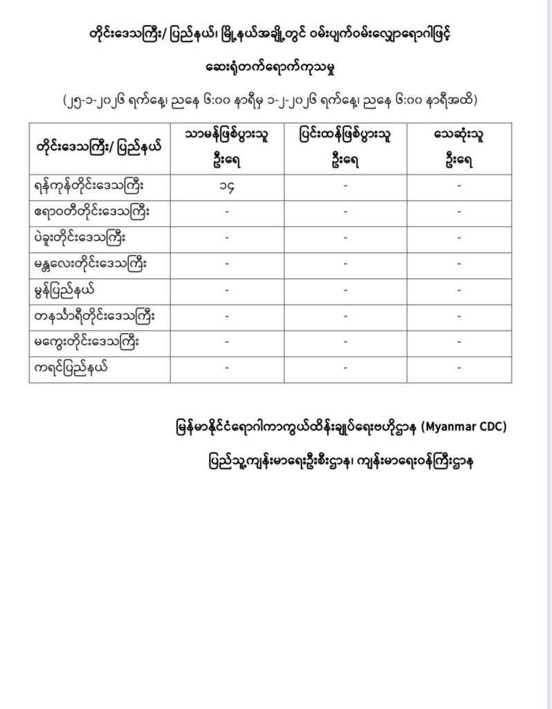 ရန်ကုန်တိုင်းဒေသကြီး၊ ဧရာဝတီတိုင်းဒေသကြီး၊ ပဲခူးတိုင်းဒေသကြီး၊ မန္တလေးတိုင်းဒေသကြီး၊ မွန်ပြည်နယ်၊ တနင်္သာရီတိုင်းဒေသကြီး၊ မကွေးတိုင်းဒေသကြီးနှင့် ကရင်ပြည်နယ်အတွင်းရှိ မြိုနယ်များတွင် ဝမ်းပျက်ဝမ်းလျှောရောဂါဖြင့် ဆေးရုံတက်ရောက်ကုသမှု (၂၅-၁-၂၀၂၆ ရက်နေ့၊ ညနေ ၆:၀၀ နာရီမှ ၁-၂-၂၀၂၆ ရက်နေ့၊ ညနေ ၆:၀၀ နာရီအထိ)