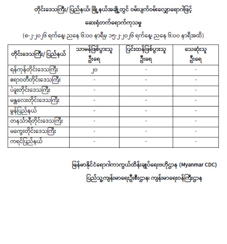 ရန်ကုန်တိုင်းဒေသကြီး၊ ဧရာဝတီတိုင်းဒေသကြီး၊ ပဲခူးတိုင်းဒေသကြီး၊ မန္တလေးတိုင်းဒေသကြီး၊ မွန်ပြည်နယ်၊ တနင်္သာရီတိုင်းဒေသကြီး၊ မကွေးတိုင်းဒေသကြီးနှင့် ကရင်ပြည်နယ်အတွင်းရှိ မြိုနယ်များတွင် ဝမ်းပျက်ဝမ်းလျှောရောဂါဖြင့် ဆေးရုံတက်ရောက်ကုသမှု (၈-၂-၂၀၂၆ ရက်နေ့၊ ညနေ ၆:၀၀ နာရီမှ ၁၅-၂-၂၀၂၆ ရက်နေ့၊ ညနေ ၆:၀၀ နာရီအထိ)