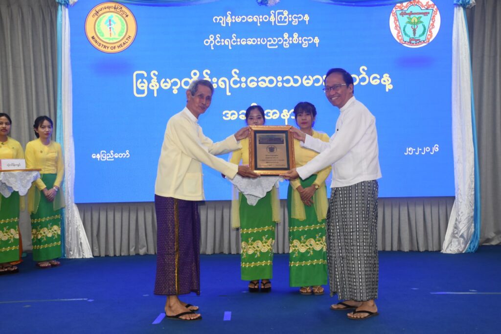 | ယင်းနောက် တိုင်းရင်းဆေးပညာဦးစီဌာန၊ ညွှန်ကြားရေးမှူးချုပ် ဒေါက်တာစုစုဒွေးက မြန်မာ့တိုင်းရင်းဆေးသမားတော်နေ့ ကျင်းပရခြင်းနှင့် ပတ်သက်၍ ရှင်းလင်းပြောကြားပြီး ပြည်ထောင်စုဝန်ကြီးက သက်ကြီး၊ ဝါကြီး တိုင်းရင်းဆေးသမားတော်ကြီးများအား ဂါရဝပြုလက်ဆောင်နှင့် သိပ္ပကျော်စွာဘွဲ့ရ မြန်မာနိုင်ငံတိုင်းရင်းဆေးကောင်စီနာယက တိုင်းရင်းဆေးဆရာကြီးဦးမြင့်လွင်အား ဂုဏ်ပြုဆုချီးမြှင့်သည်။ | |