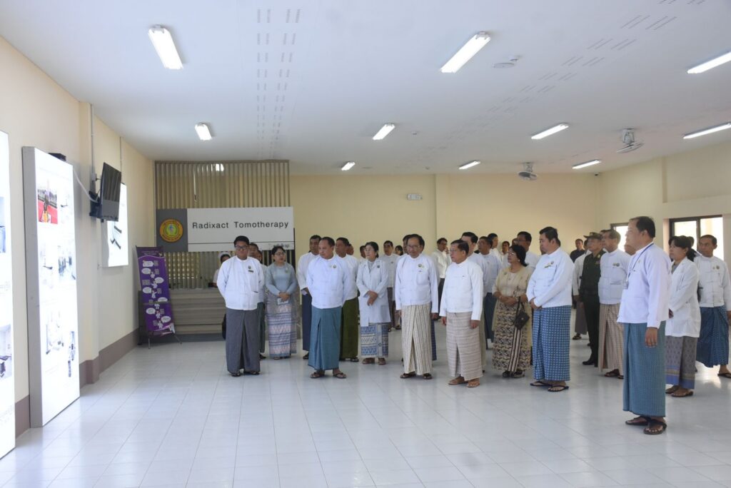 ဆက်လက်၍ နိုင်ငံတော်ယာယီသမ္မတ နိုင်ငံတော်လုံခြုံရေးနှင့်အေးချမ်းသာယာရေးကော်မရှင်ဥက္ကဋ္ဌနှင့် အခမ်းအနားတက်ရောက်လာကြသူများသည် ကုသဆောင်အတွင်းရှိ ဓာတ်ရောင်ခြည်ဖြင့် ကင်ဆာရောဂါကုသမှု စက်ခန်းများအား လိုက်လံကြည့်ရှုပြီး ကျန်းမာရေးဝန်ကြီးဌာန ပြည်ထောင်စုဝန်ကြီးနှင့် စက်ခန်းအလိုက် ကုသရေးပါရဂူများ၏ ရှင်းလင်းတင်ပြမှုများအပေါ် လိုအပ်သည်များ လမ်းညွှန်မှာကြားသည်။