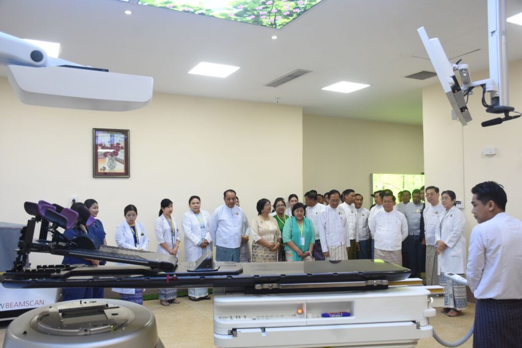 ကင်ဆာရောဂါ ကုသမှုတွင် ဆေးသွင်းကုသခြင်း၊ ခွဲစိတ်ကုသခြင်းနှင့် ဓာတ်ရောင်ခြည်နှင့်ကုသခြင်း စသည့် ကုထုံးအမျိုးမျိုးရှိကြောင်း၊ ဓာတ်ရောင်ခြည်နှင့် ကုသခြင်းသည် ရောဂါကိုပျောက်ကင်းစေခြင်းနှင့် ရောဂါပြန့်ပွားမှုကို ထိန်းချုပ်နိုင်ခြင်းတို့အတွက် အလွန်အရေးပါသည့် ကုသမှုတစ်ခုဖြစ်ကြောင်း၊ ကင်ဆာလူနာများ ဓာတ်ရောင်ခြည်နှင့် ကုသခံရန်စောင့်ဆိုင်းရသည့် အချိန်ကိုလျှော့ချနိုင်ရန်အတွက် ဓာတ်ရောင်ခြည်ကုသစက်များ ဝယ်ယူတပ်ဆင်ရေး လိုအပ်သည့်ရန်ပုံငွေကို အထူးဦးစားပေး ခွင့်ပြုပေးခဲ့ကြောင်း၊ ထိုကြောင့် ယခုမြန်မာနိုင်ငံတွင် ဓာတ်ရောင်ခြည် ကုသစက်စုစုပေါင်း ၂၆ လုံး၊ Brachytherapy ဓာတ်အပ်စိုက် ကိရိယာကိုးလုံးအထိ တိုးတက်တပ်ဆင်အသုံးပြုပြီး ကုသပေးနေပြီဖြစ်ကြောင်း၊ ၂၀၂၁ ခုနှစ် နောက်ပိုင်းရန်ကုန်၊ မန္တလေးနှင့် နေပြည်တော်တိုတွင်ရှိသည့် ဆေးရုံကြီးများတွင် ဓာတ်ရောင်ခြည်ကုသ စက်အသစ်ခုနစ်လုံး တပ်ဆင်ပေးနိုင်ခဲ့သဖြင့် ကျန်းမာရေးဝန်ကြီးဌာန ပြည်သူ့ဆေးရုံကြီးများနှင့် ဌာနများတွင် ဓာတ်ရောင်ခြည်စင်တာငါးခု၊ ဓာတ်ရောင်ခြည်ကုသစက် ၁၅ လုံး၊ ဓာတ်အပ်စိုက်ကိရိယာလေးလုံးရှိနေပြီဖြစ်ကြောင်း၊ ထို့အပြင် တပ်မတော်ဆေးရုံများတွင် ဓာတ်ရောင်ခြည်စင်တာလေးခု၊ ဓာတ်ရောင်ခြည်ကုသစက်လေးလုံး၊ ဓာတ်အပ်စိုက်ကိရိယာ တစ်လုံးနှင့် ကုသမှုပေးနိုင်နေပြီဖြစ်ကြောင်း၊ ပုဂ္ဂလိကကဏ္ဍတွင်လည်း အဆင့်မြင့်ဓာတ်ရောင်ခြည်ကုသ စက်ကြီးများနှင့် ကုသခွင့်ကိုခွင့်ပြုပေးထားသဖြင့် ပုဂ္ဂလိကဆေးရုံများတွင် ဓာတ်ရောင်ခြည်စင်တာငါးခု၊ ဓာတ်ရောင်ခြည် ကုသစက်ခုနစ်လုံး၊ ဓာတ်အပ်စိုက်ကိရိယာလေးလုံး တပ်ဆင်အသုံးပြုလျက်ရှိသည်ကို သိရှိရကြောင်း၊ ယနေ့ဖွင့်လှစ်သည့် အမျိုးသားကင်ဆာကုသရေးဗဟိုဌာနကို ကင်ဆာဝေဒနာရှင်များအတွက် တစ်နေရာတည်းတွင် ပြည့်စုံသည့် ကုသမှုစင်တာ (One – stop Comprehensive Care Center)အဖြစ် ဆေးကုသမှုများပေးနိုင်ရန်နှင့် သုတေသနလုပ်ငန်းများကိုပါ လုပ်ဆောင်နိုင်ရန် ရည်ရွယ်ဖွင့်လှစ်ခဲ့ခြင်းဖြစ်ကြောင်း၊ ငါးထပ်ကုသဆောင်၊ ရှစ်ထပ်ကုသဆောင်များနှင့် ဓာတ်ရောင်ခြည်စက်ခန်းများအတွက် နိုင်ငံတော်မှ ငွေကျပ် ၃၄ ဘီလီယံကျော်၊ ဝန်ထမ်းအိမ်ရာများအတွက် ငွေကျပ် ၁၂ ဘီလီယံကျော်နှင့် ဓာတ်ရောင်ခြည်ကုသစက်အသစ်သုံးလုံးအတွက် (၂၀၂၄-၂၀၂၅) ဘဏ္ဍာနှစ်အတွင်း ငွေကျပ် ၃၀ ဘီလီယံကျော်ကို ခွင့်ပြုပေးခဲ့ကြောင်း၊ ယခုနှစ်တွင် အလှူရှင်များ လှူဒါန်းသည့် စက်တစ်လုံးသည်လည်း ငွေကျပ် ၁၉ ဘီလီယံတန်ဖိုးရှိကြောင်း သိရှိရပြီး လှူဒါန်းမှုအတွက် ကျေးဇူးတင်ရှိသည်ကို ပြောကြားလိုကြောင်း။